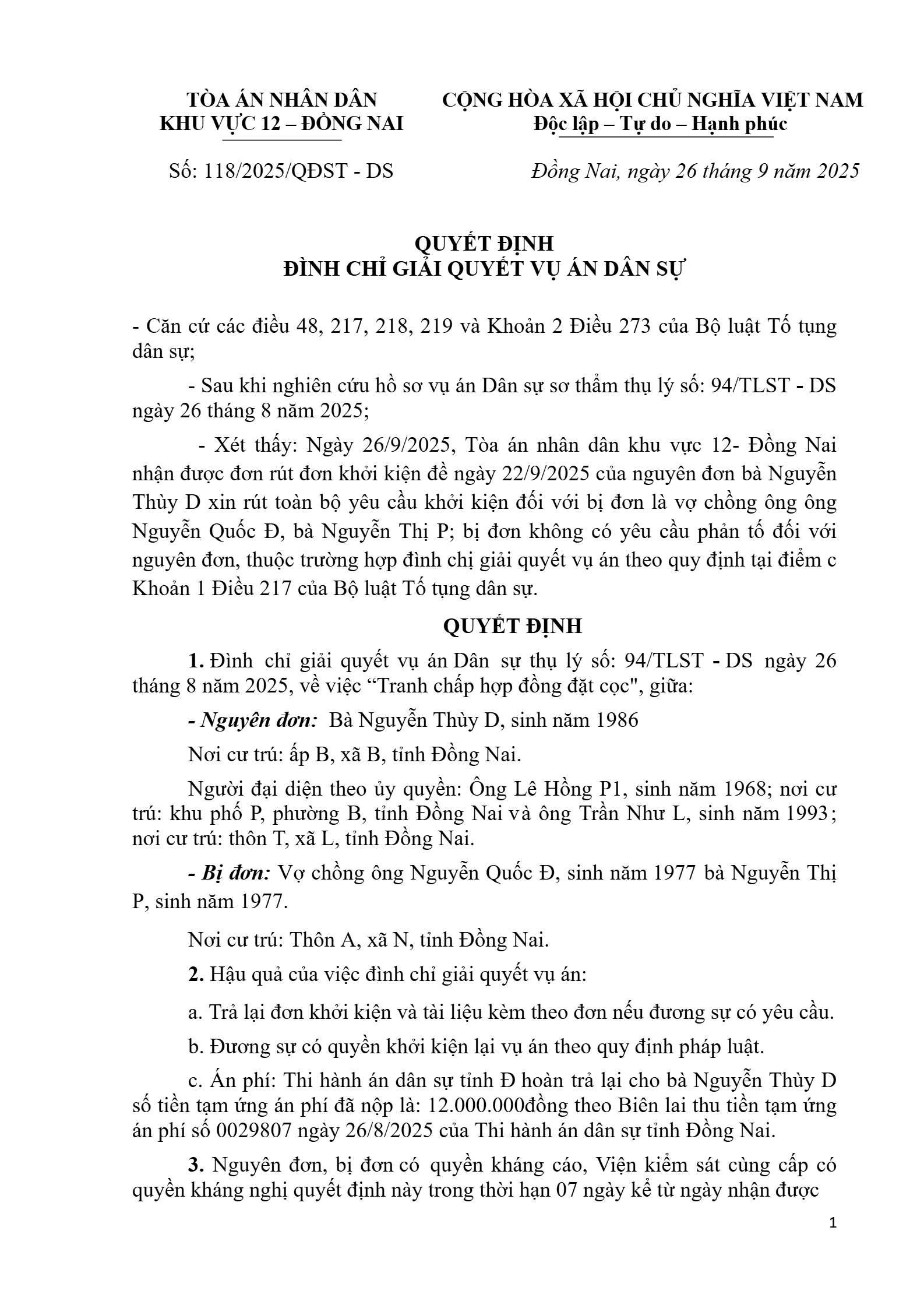 Quyết định số 118/2025/QĐST ngày 26/09/2025 của Tòa án nhân dân khu vực 12 - Đồng Nai, tỉnh Đồng Nai về tranh chấp hợp đồng đặt cọc