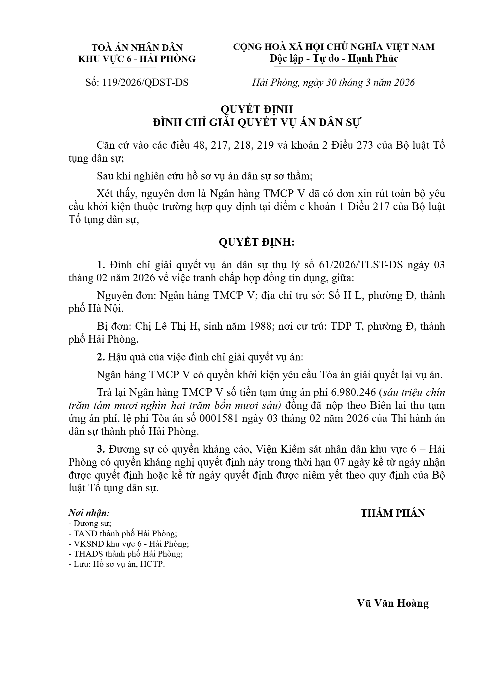 Quyết định số 119/2026/QĐST-DS ngày 30/03/2026 của Tòa án nhân dân khu vực 6 - Hải Phòng, TP. Hải Phòng về tranh chấp hợp đồng tín dụng
