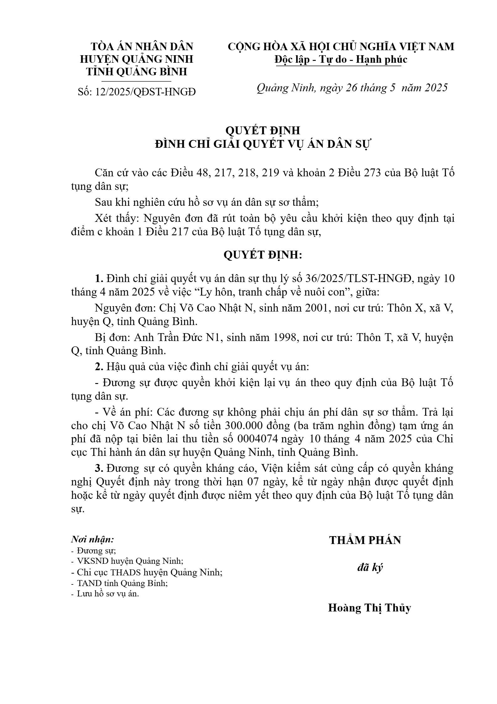 Quyết định số 12/2025/QĐST-HNGĐ ngày 26/05/2025 của TAND huyện Quảng Ninh, tỉnh Quảng Bình về vụ án ly hôn về mâu thuẫn gia đình