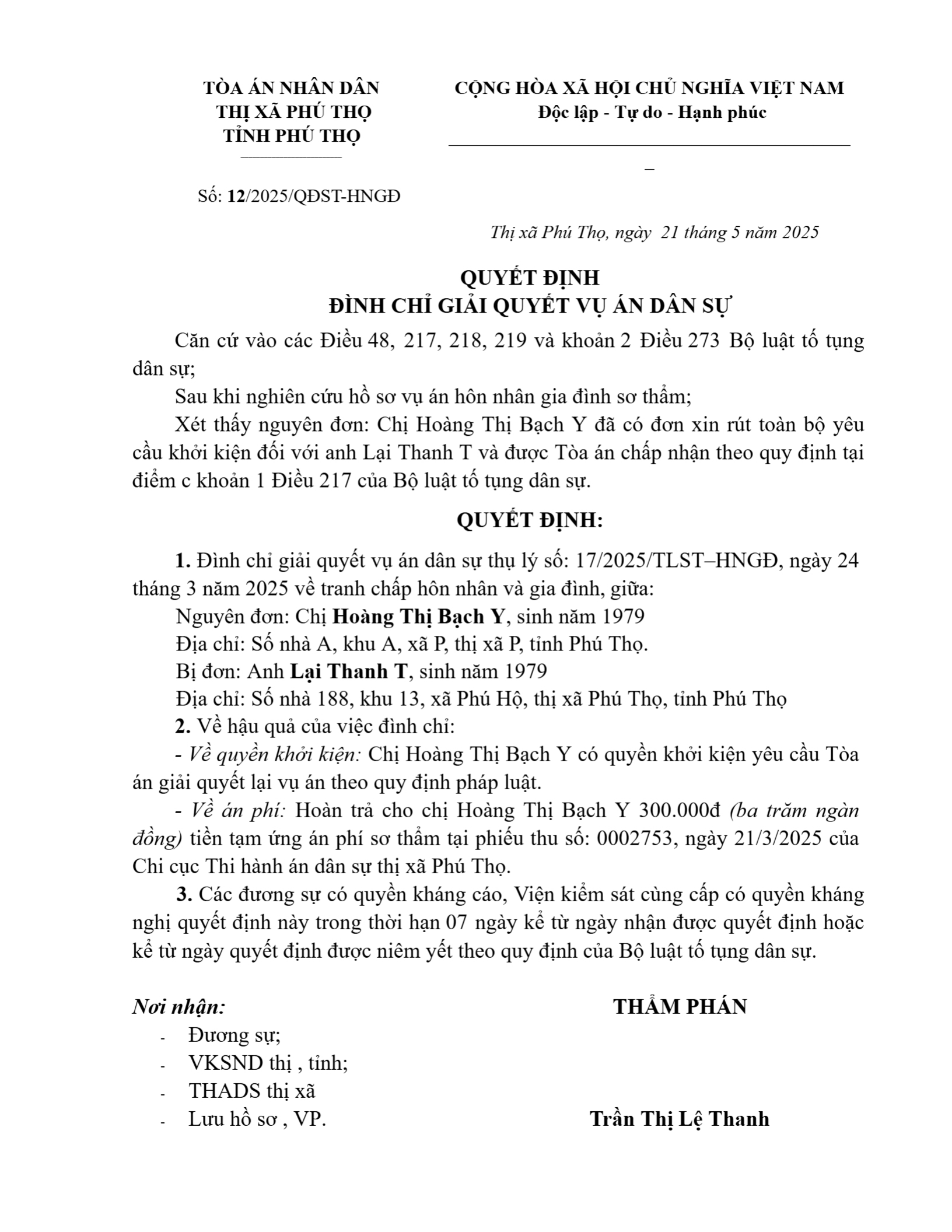 Quyết định số 12/2025/QĐST-HNGĐ ngày 21/05/2025 của TAND TX. Phú Thọ, tỉnh Phú Thọ về vụ án ly hôn về mâu thuẫn gia đình