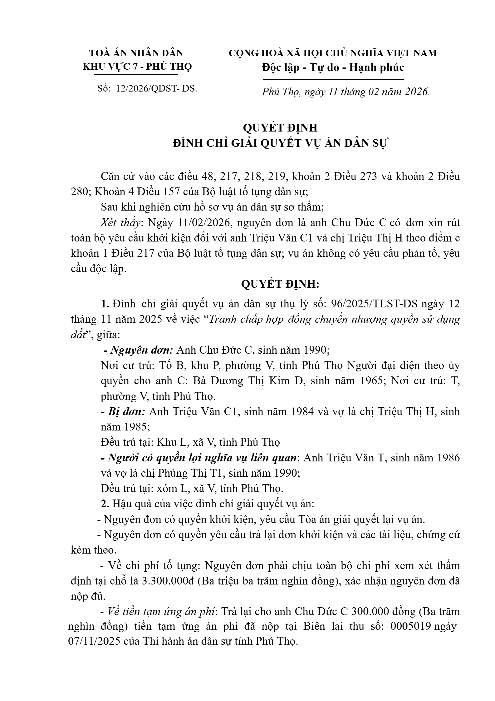Quyết định số 12/2026/QĐST-DS ngày 11/02/2026 của Tòa án nhân dân khu vực 7 - Phú Thọ, tỉnh Phú Thọ về tranh chấp hợp đồng chuyển nhượng quyền sử dụng đất