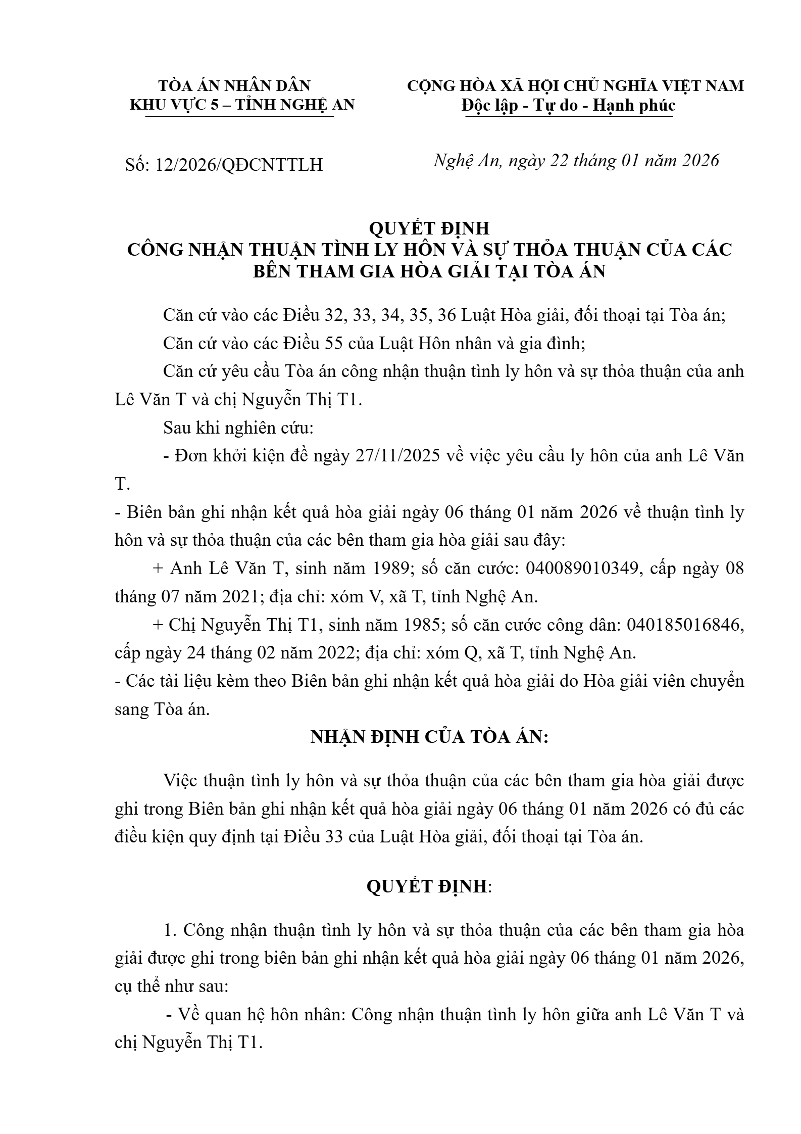 Quyết định số 12/2026/QĐST-HNGĐ ngày 22/01/2026 của Tòa án nhân dân khu vực 5 - Nghệ An, tỉnh Nghệ An về vụ án ly hôn về mâu thuẫn gia đình