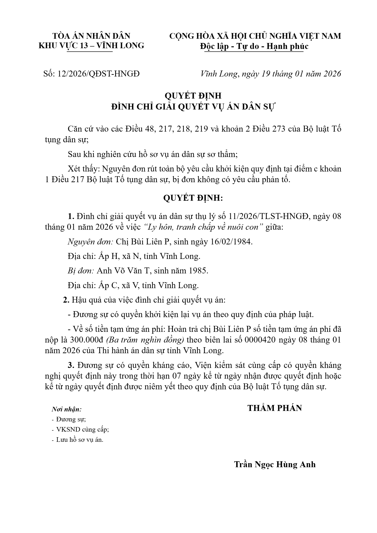 Quyết định số 12/2026/QĐST-HNGĐ ngày 19/01/2026 của Tòa án nhân dân khu vực 13 - Vĩnh Long, tỉnh Vĩnh Long về vụ án ly hôn về mâu thuẫn gia đình