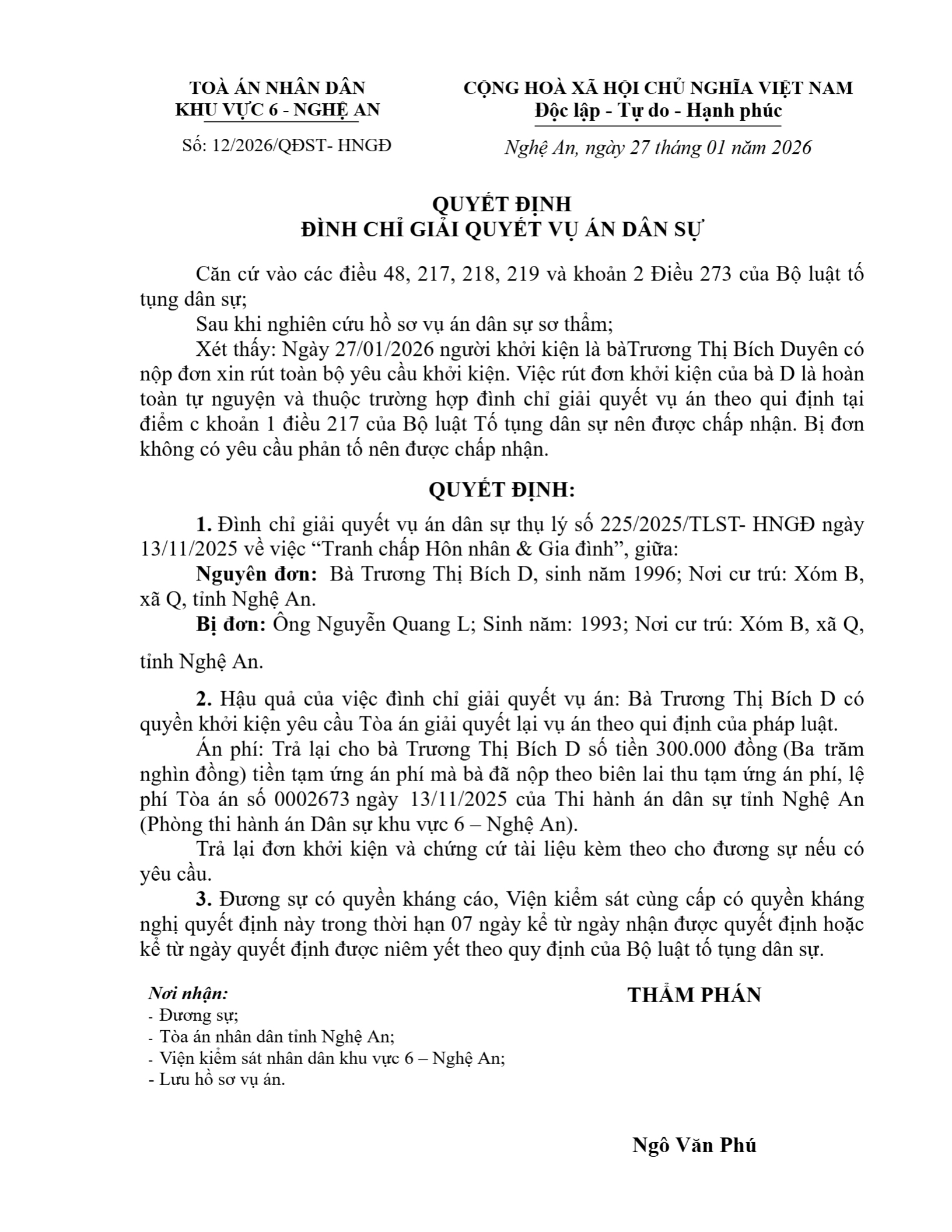 Quyết định số 12/2026/QĐST-HNGĐ ngày 27/01/2026 của Tòa án nhân dân khu vực 6 - Nghệ An, tỉnh Nghệ An về vụ án ly hôn về mâu thuẫn gia đình