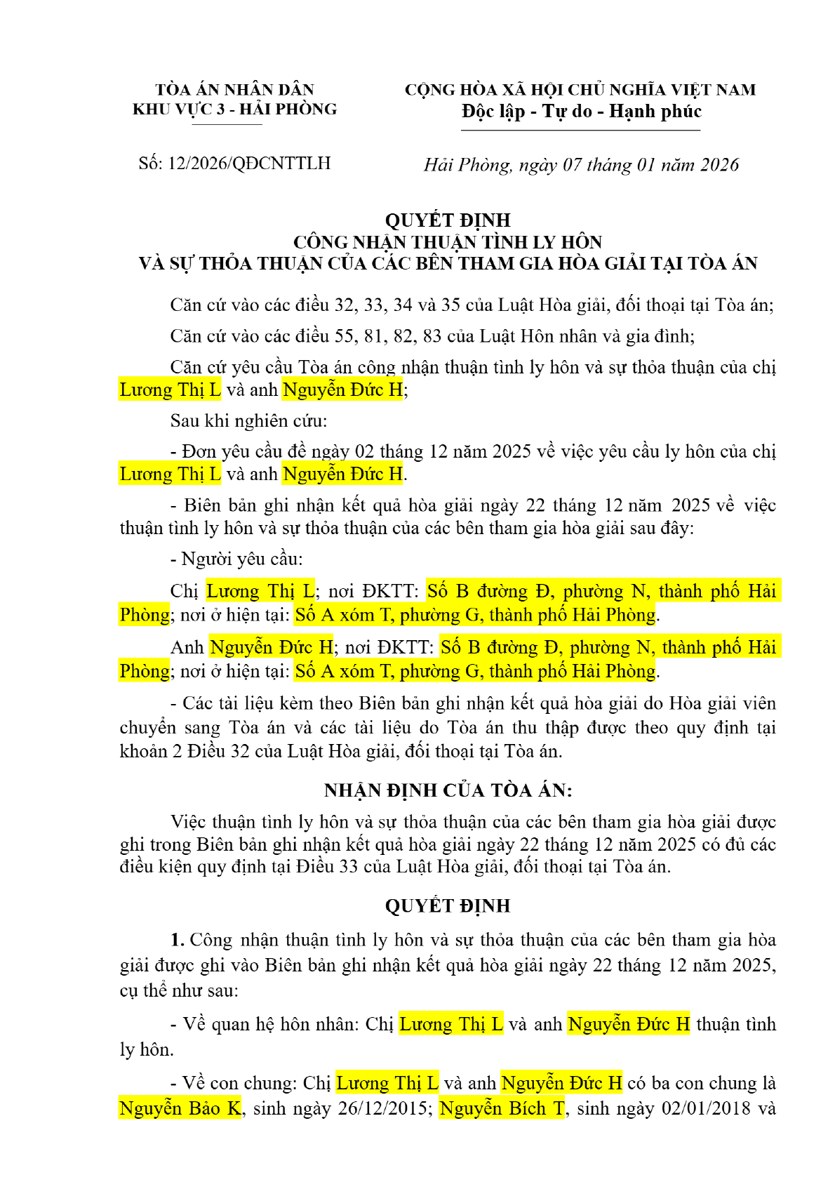 | Tên Quyết định: | Quyết định số 12/2026/QĐST-HNGĐ ngày 07/01/2026 của Tòa án nhân dân khu vực 3 - Hải Phòng, TP. Hải Phòng về yêu cầu công nhận thuận tình ly hôn |