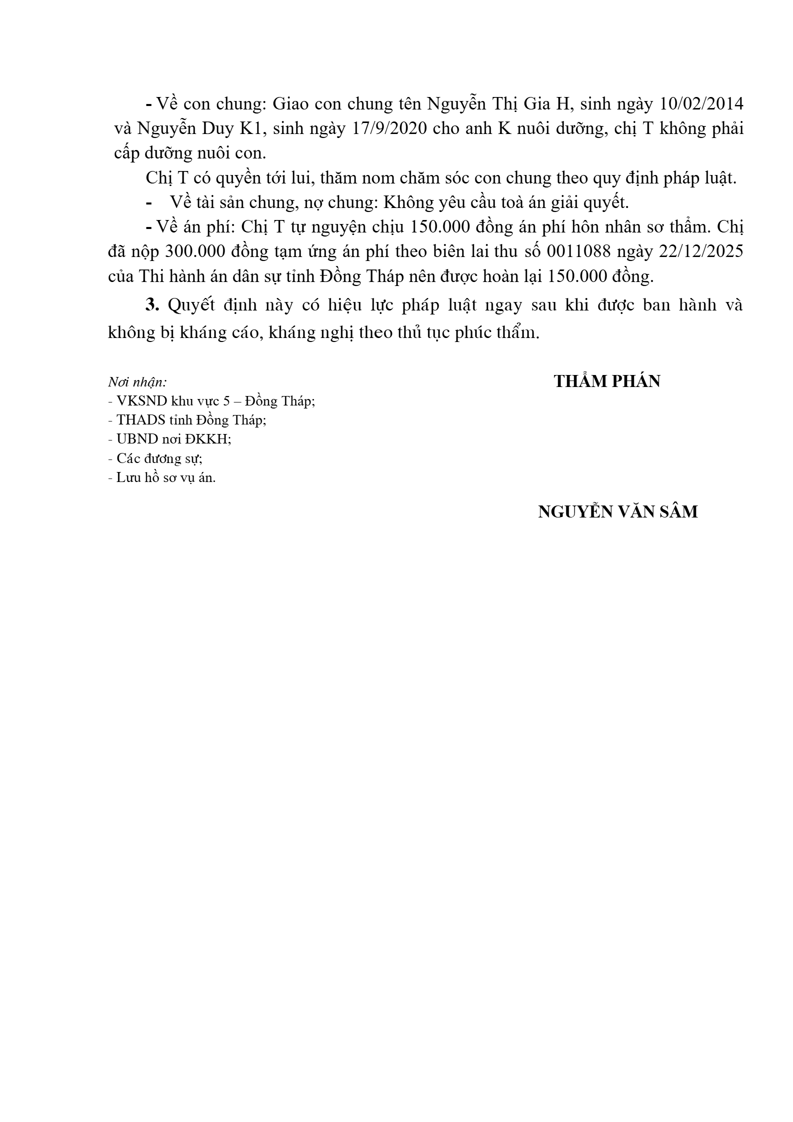 Quyết định số 12/2026/QĐST-HNGĐ ngày 20/01/2026 của Tòa án nhân dân khu vực 5 - Đồng Tháp, tỉnh Đồng Tháp về vụ án ly hôn về mâu thuẫn gia đình