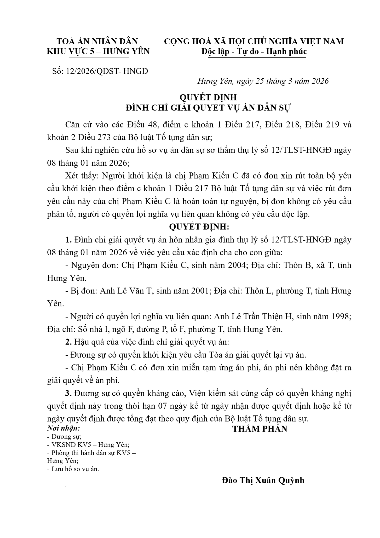 Quyết định số 12/2026/QĐST-HNGĐ ngày 25/03/2026 của Tòa án nhân dân khu vực 5 - Hưng Yên, tỉnh Hưng Yên về tranh chấp về xác định cha, mẹ cho con hoặc con cho cha mẹ