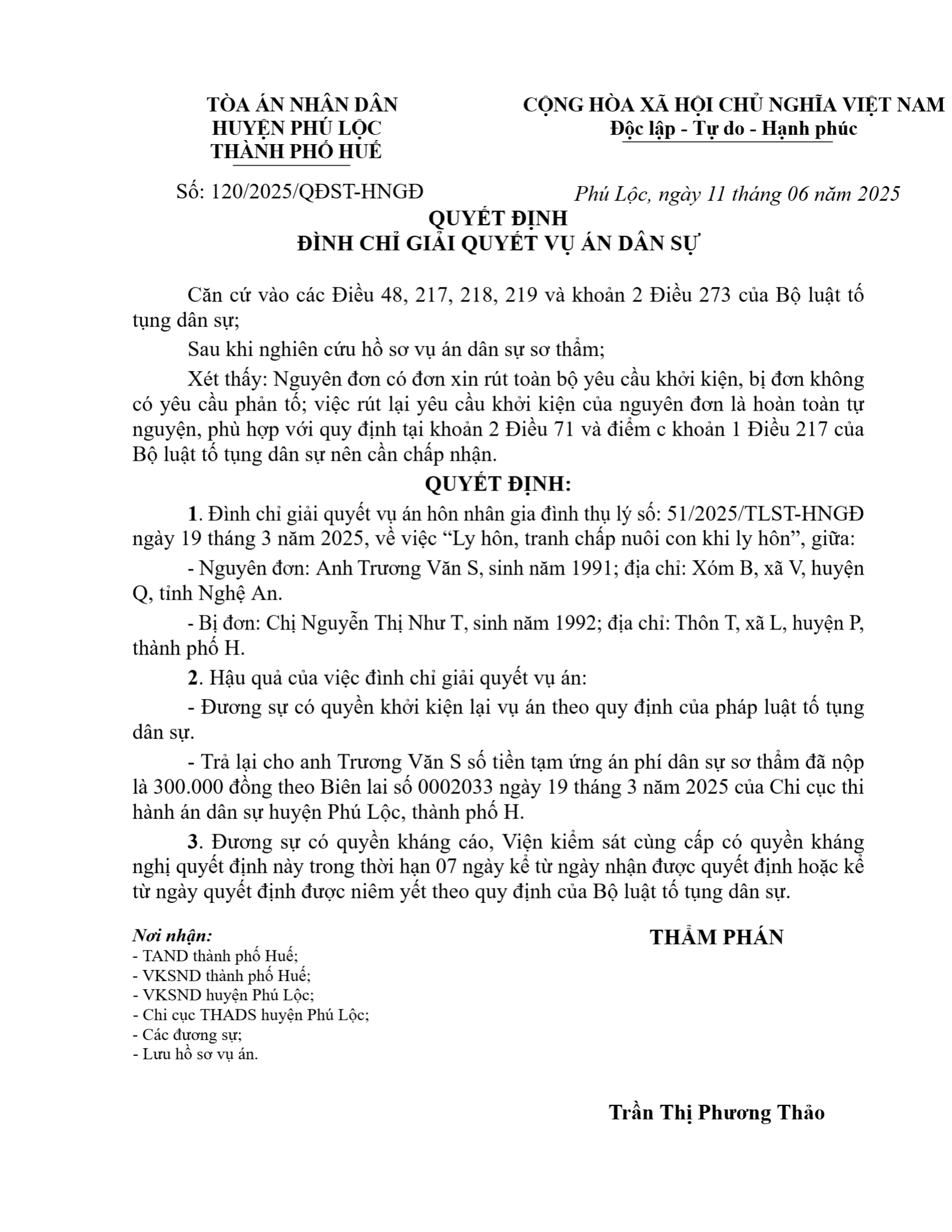 Quyết định số 120/2025/QĐST-HNGĐ ngày 11/06/2025 của TAND huyện Phú Lộc, tỉnh Thừa Thiên Huế về vụ án ly hôn về mâu thuẫn gia đình
