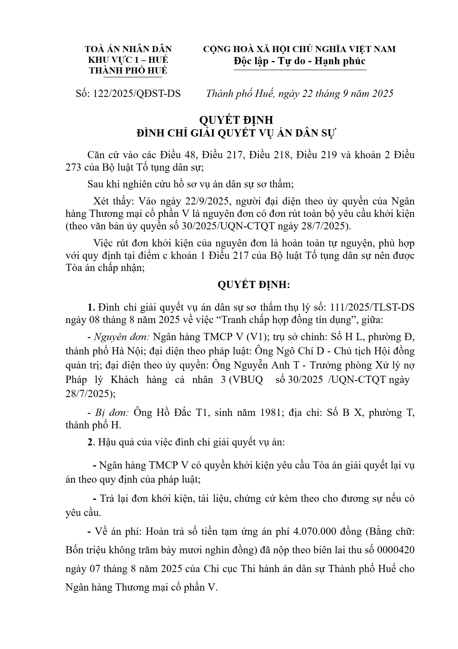 Quyết định số 122/2025/QĐST-DS ngày 22/09/2025 của Tòa án nhân dân khu vực 1 - Huế, TP. Huế về tranh chấp hợp đồng tín dụng