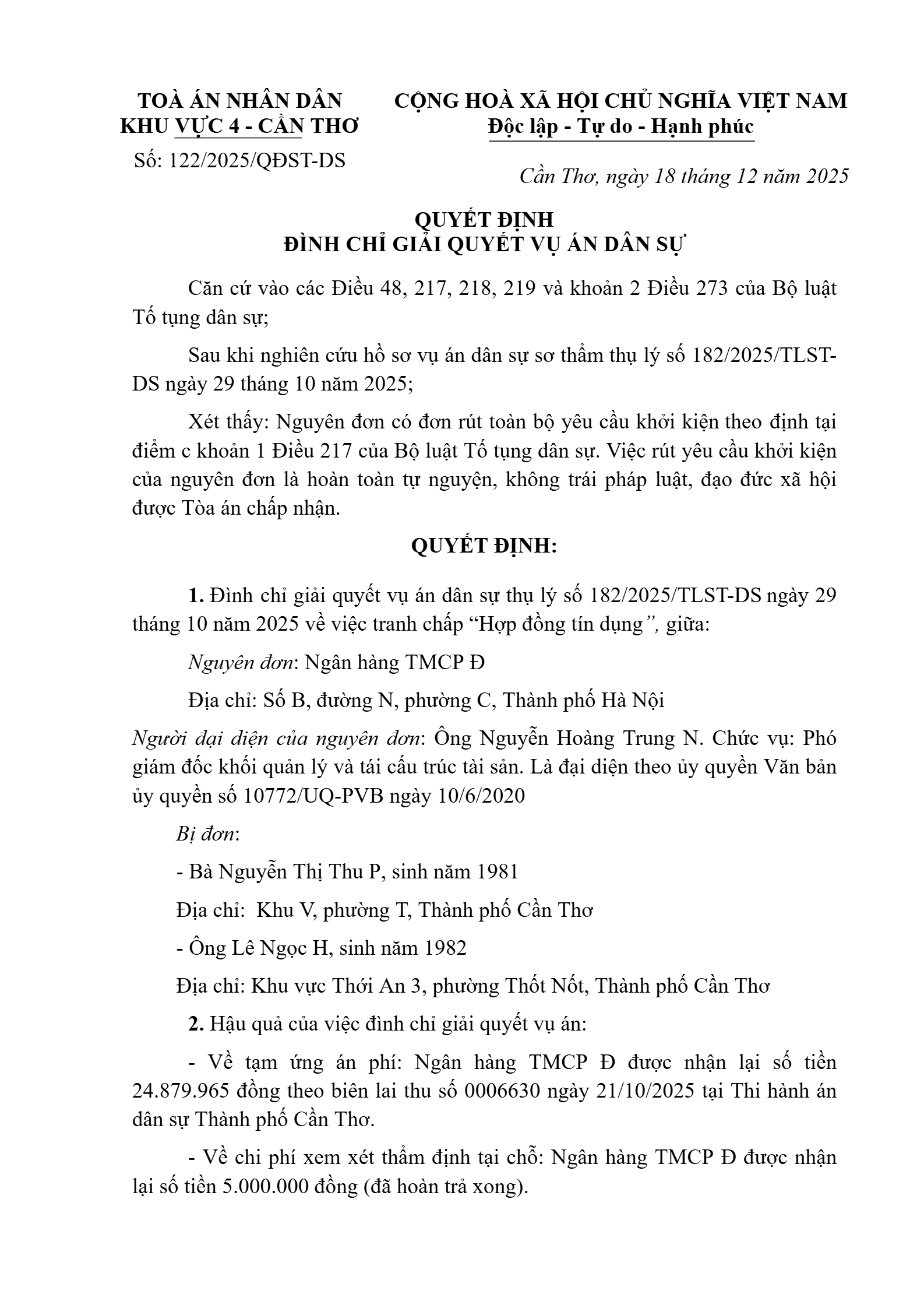 Quyết định số 122/2025/QĐST-DS ngày 18/12/2025 của Tòa án nhân dân khu vực 4 - Cần Thơ, TP. Cần Thơ về tranh chấp hợp đồng tín dụng