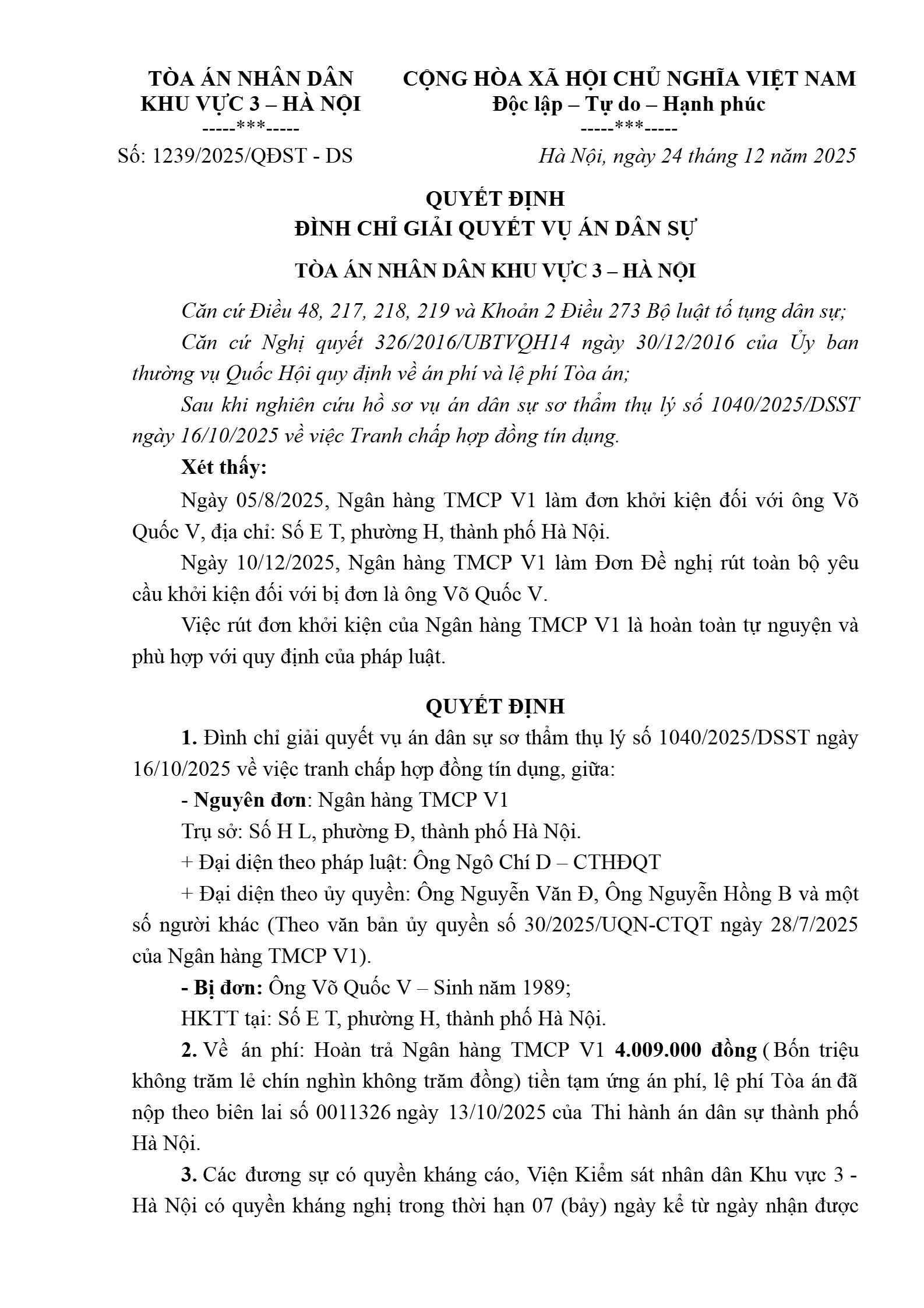 Quyết định số 1239/2025/QĐST-DS ngày 24/12/2025 của Tòa án nhân dân khu vực 3 - Hà Nội, TP. Hà Nội về tranh chấp hợp đồng tín dụng