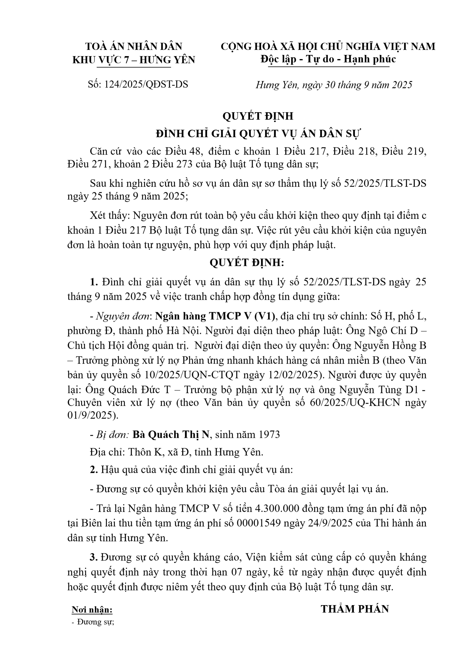 Quyết định số 124/2025/QĐST-DS ngày 30/09/2025 của Tòa án nhân dân khu vực 7 - Hưng Yên, tỉnh Hưng Yên về tranh chấp hợp đồng tín dụng