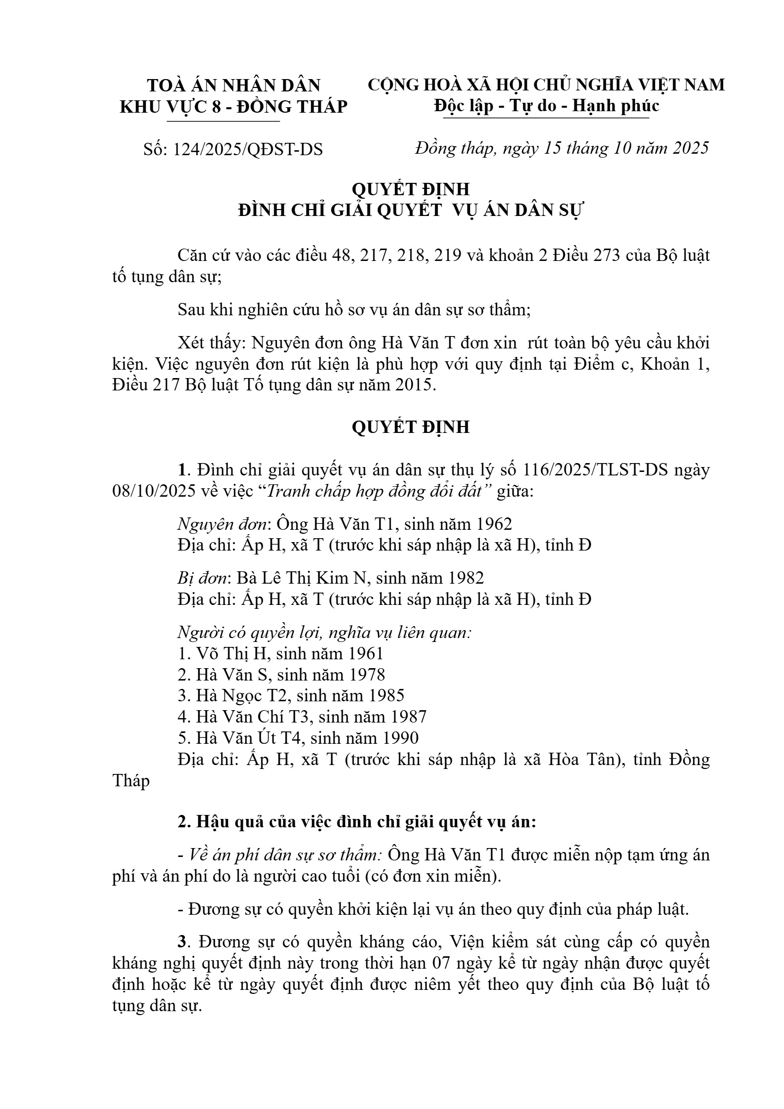 Quyết định số 124/2025/QĐST-DS ngày 15/10/2025 của Tòa án nhân dân khu vực 8 - Đồng Tháp, tỉnh Đồng Tháp về tranh chấp hợp đồng trao đổi tài sản