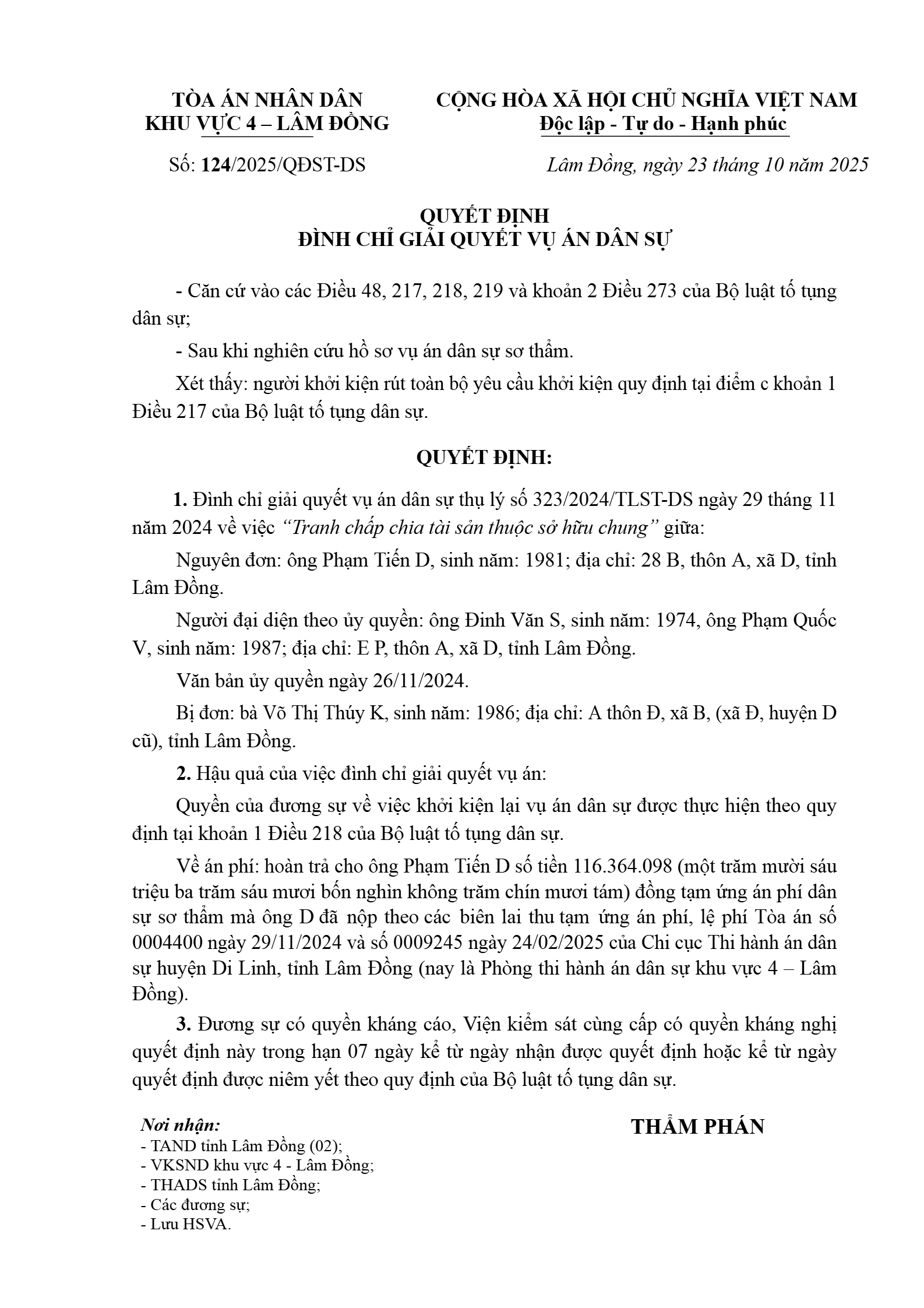 Quyết định số 124/2025/QĐST-DS ngày 23/10/2025 của Tòa án nhân dân khu vực 4 - Lâm Đồng, tỉnh Lâm Đồng về tranh chấp về chia tài sản chung