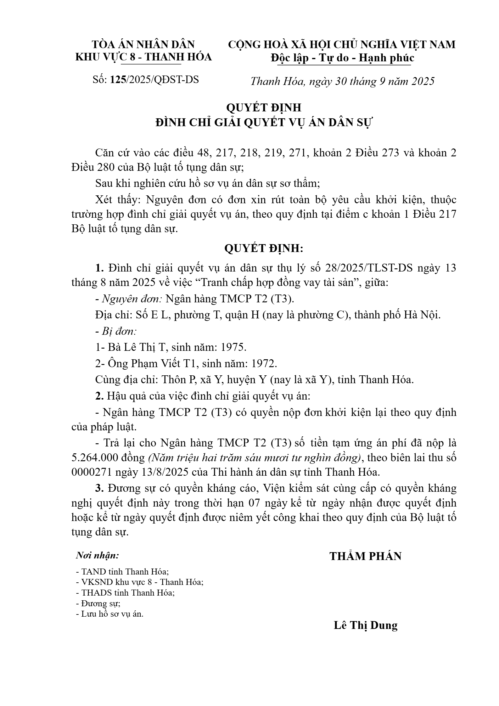 Quyết định số 125/2025/QĐST-DS ngày 30/09/2025 của Tòa án nhân dân khu vực 8 - Thanh Hóa, tỉnh Thanh Hóa về tranh chấp hợp đồng tín dụng