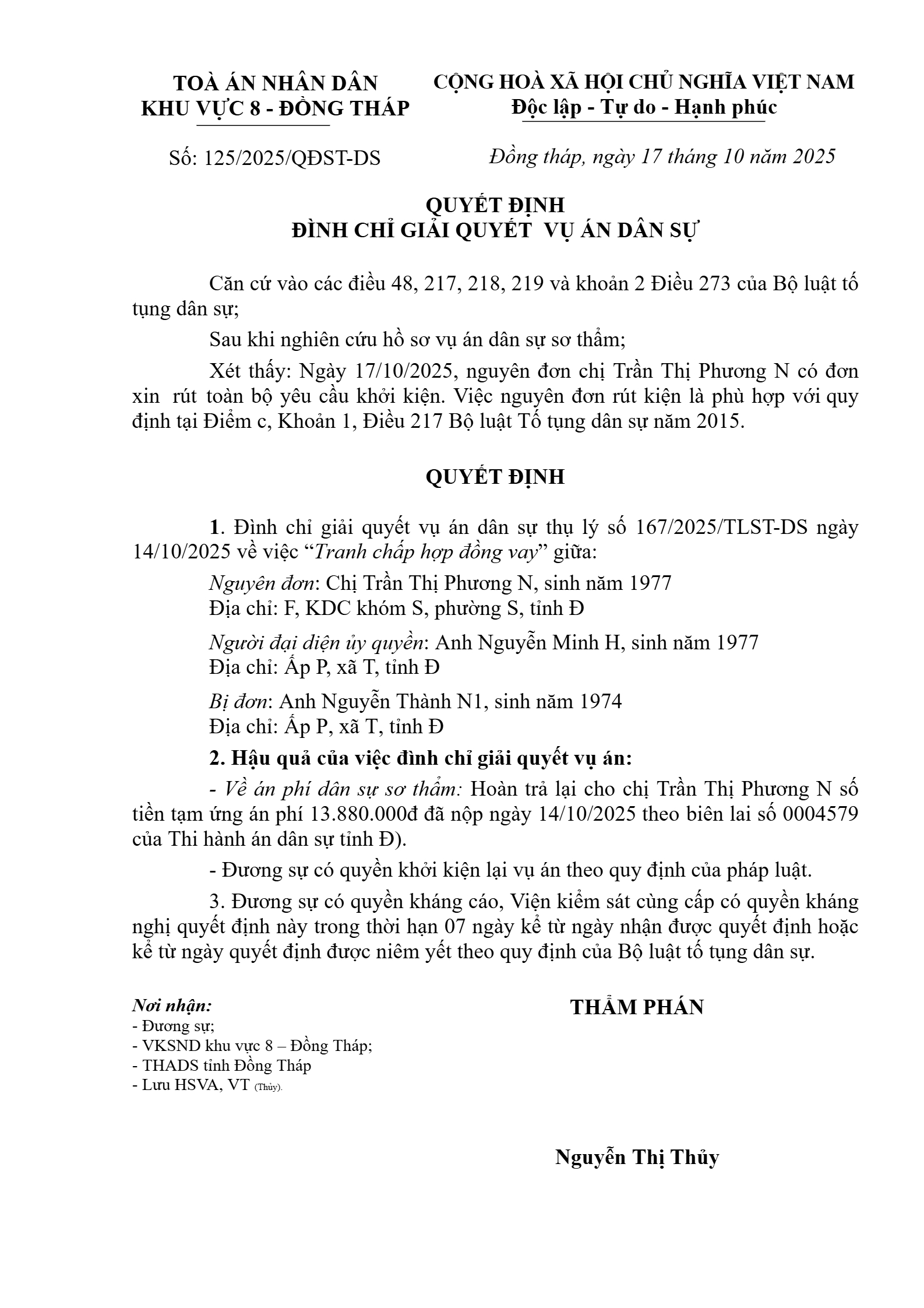 Quyết định số 125/2025/QĐST-DS ngày 17/10/2025 của Tòa án nhân dân khu vực 8 - Đồng Tháp, tỉnh Đồng Tháp về tranh chấp hợp đồng vay tài sản