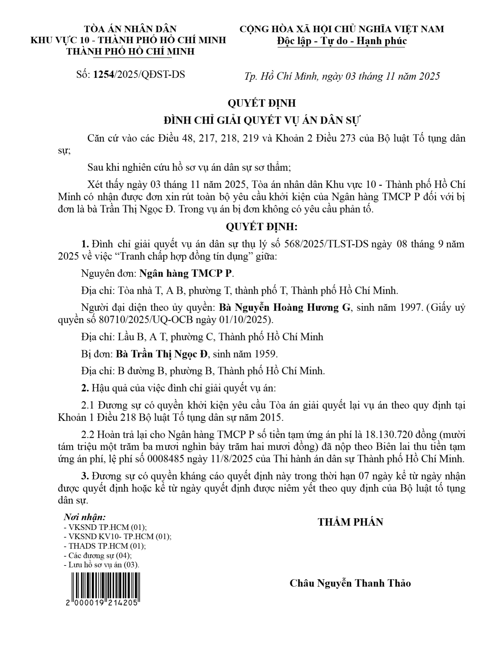 Quyết định số 1254/2025/QĐST-DS ngày 13/11/2025 của Tòa án nhân dân khu vực 10 - Hồ Chí Minh, TP. Hồ Chí Minh về tranh chấp hợp đồng tín dụng