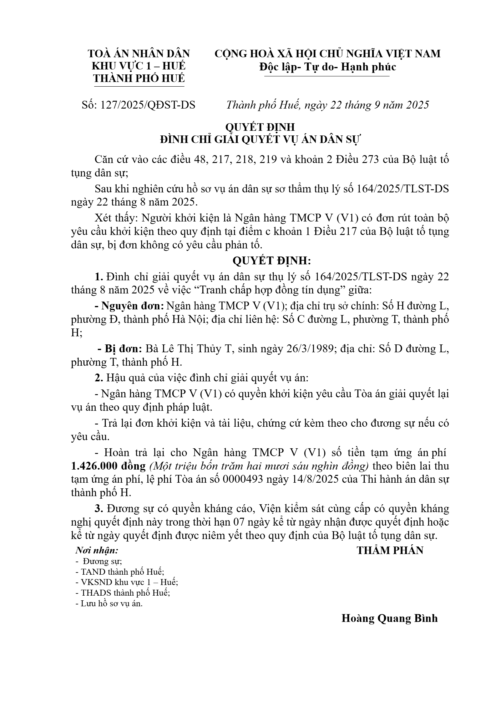 Quyết định số 127/2025/QĐST-DS ngày 22/09/2025 của Tòa án nhân dân khu vực 1 - Huế, TP. Huế về tranh chấp hợp đồng tín dụng