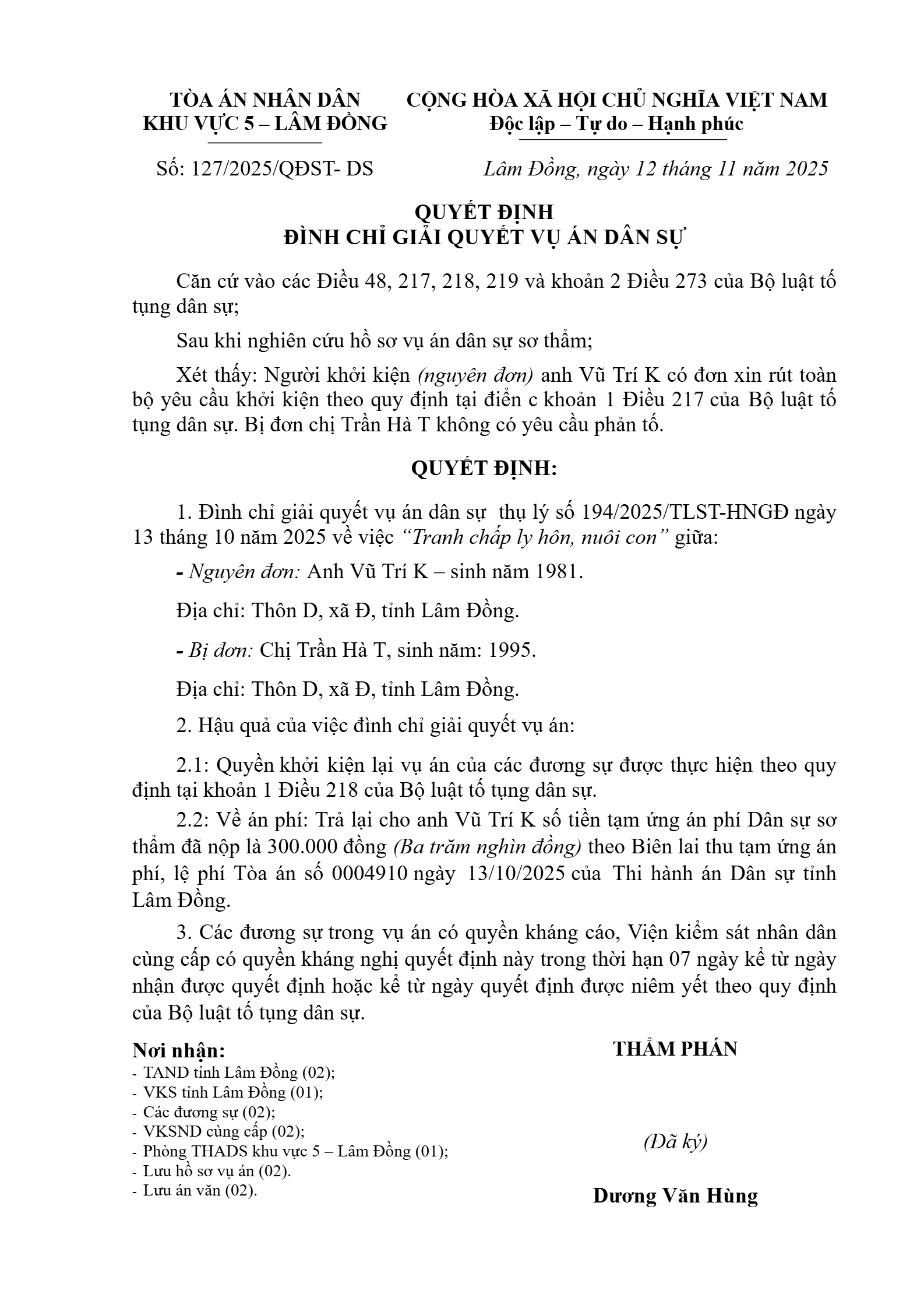 Quyết định số 127/2025/QĐST-HNGĐ ngày 12/11/2025 của Tòa án nhân dân khu vực 5 - Lâm Đồng, tỉnh Lâm Đồng về vụ án ly hôn về mâu thuẫn gia đình