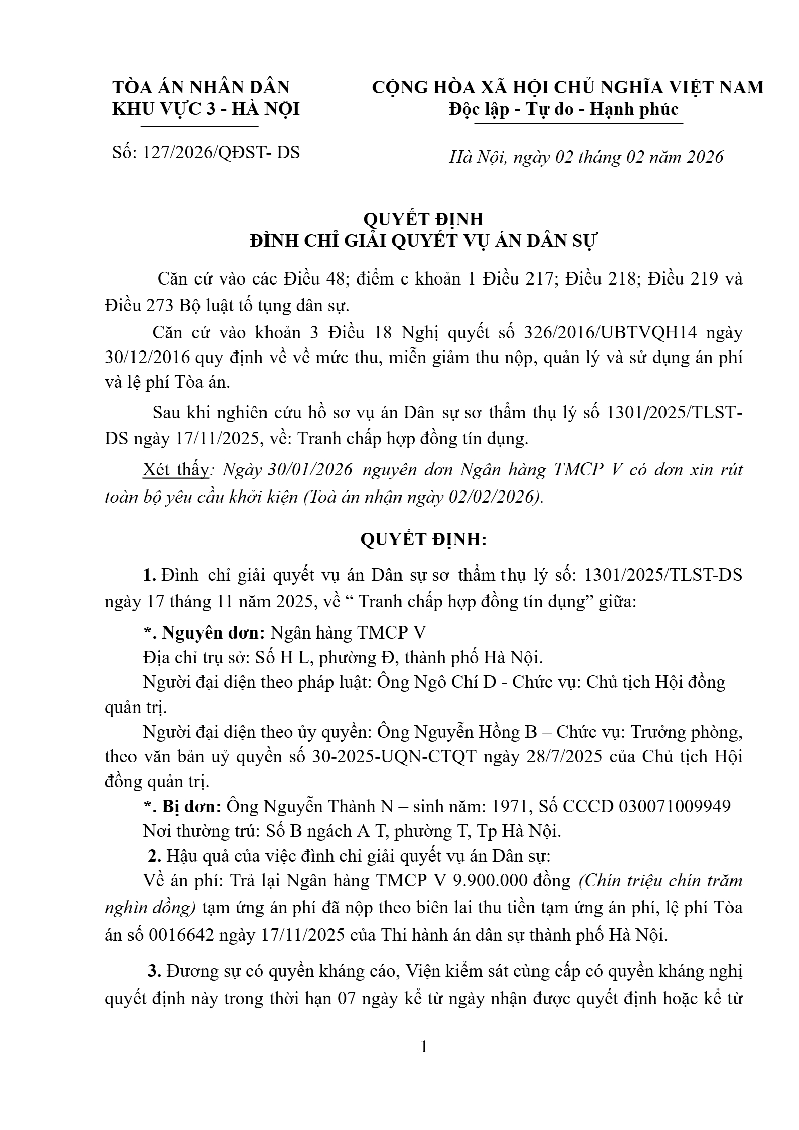 Quyết định số 127/2026/QĐST-DS ngày 02/02/2026 của Tòa án nhân dân khu vực 3 - Hà Nội, TP. Hà Nội về tranh chấp hợp đồng tín dụng
