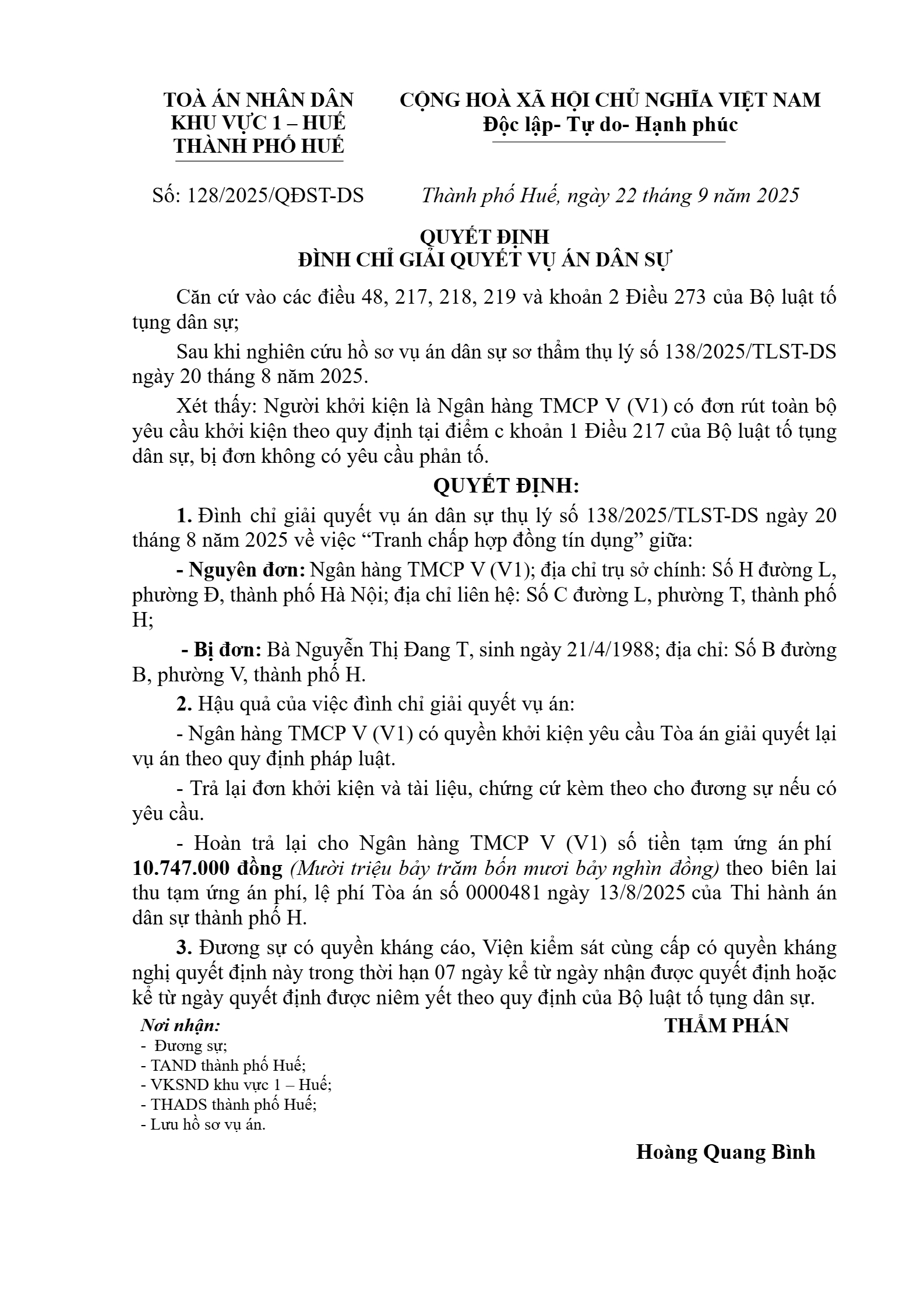 Quyết định số 128/2025/QĐST-DS ngày 22/09/2025 của Tòa án nhân dân khu vực 1 - Huế, TP. Huế về tranh chấp hợp đồng tín dụng
