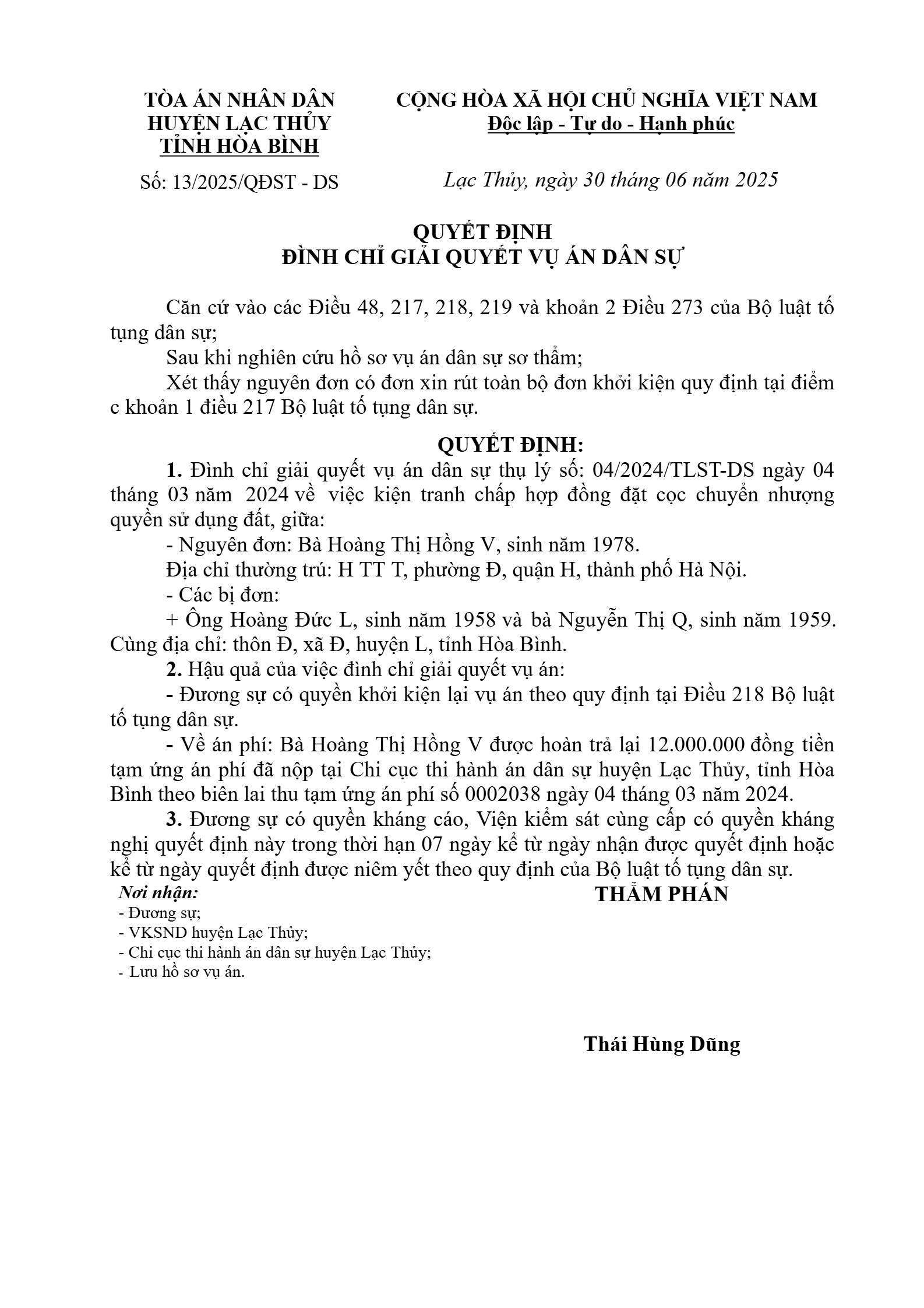 Quyết định số 13/2025/QĐDS ngày 30/06/2025 của TAND huyện Lạc Thủy, tỉnh Hòa Bình về tranh chấp hợp đồng đặt cọc