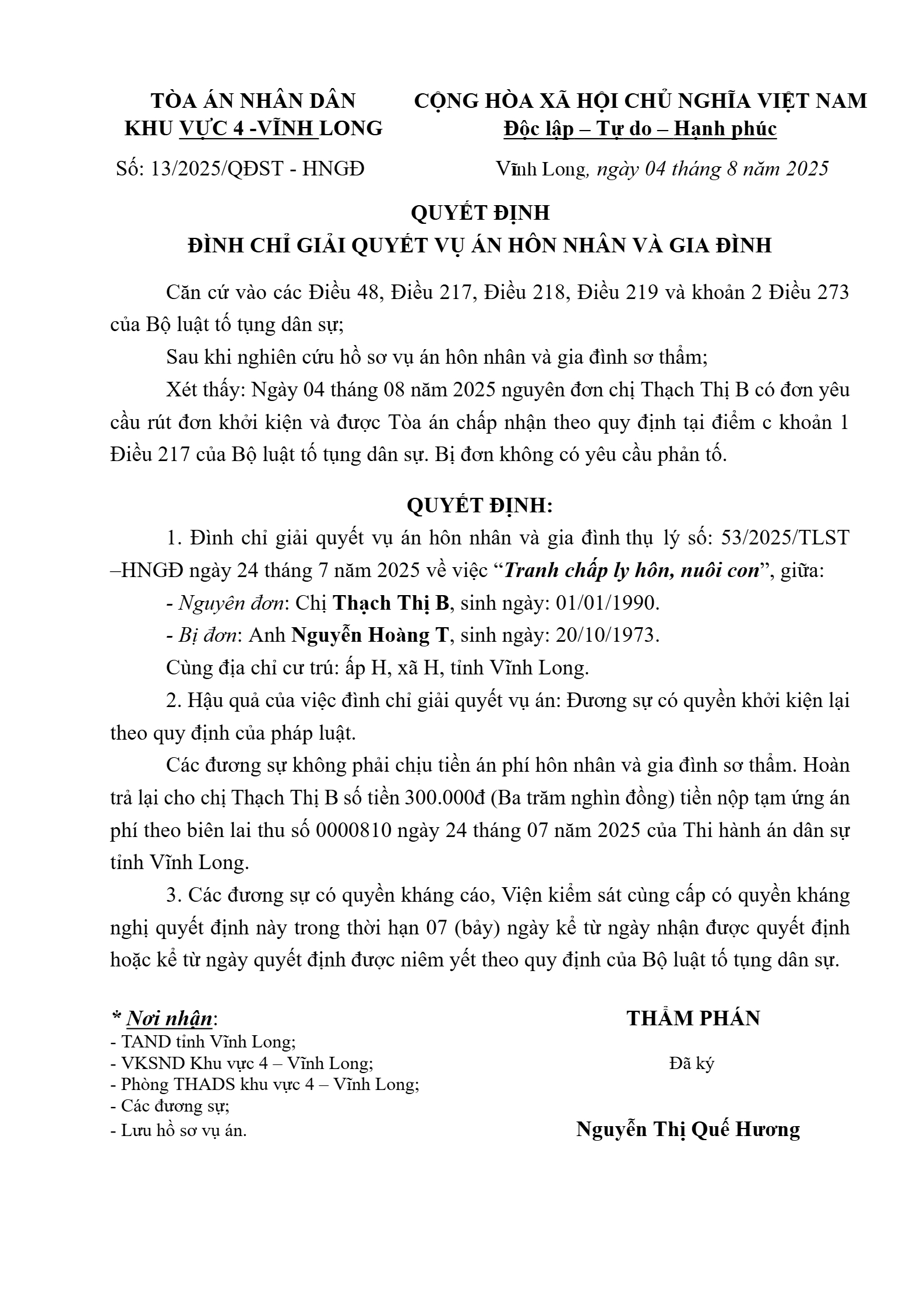 Quyết định số 13/2025/QĐST-HNGĐ ngày 04/08/2025 của Tòa án nhân dân khu vực 4 - Vĩnh Long, tỉnh Vĩnh Long về vụ án ly hôn về mâu thuẫn gia đình