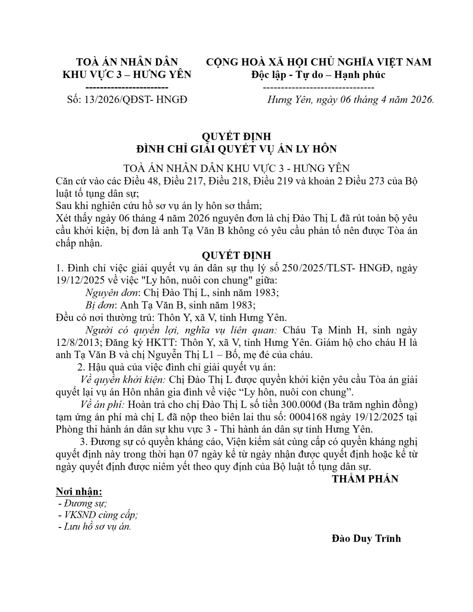 Quyết định số 13/2026/QĐST- ngày 06/04/2026 của Tòa án nhân dân khu vực 3 - Hưng Yên, tỉnh Hưng Yên về vụ án ly hôn về mâu thuẫn gia đình