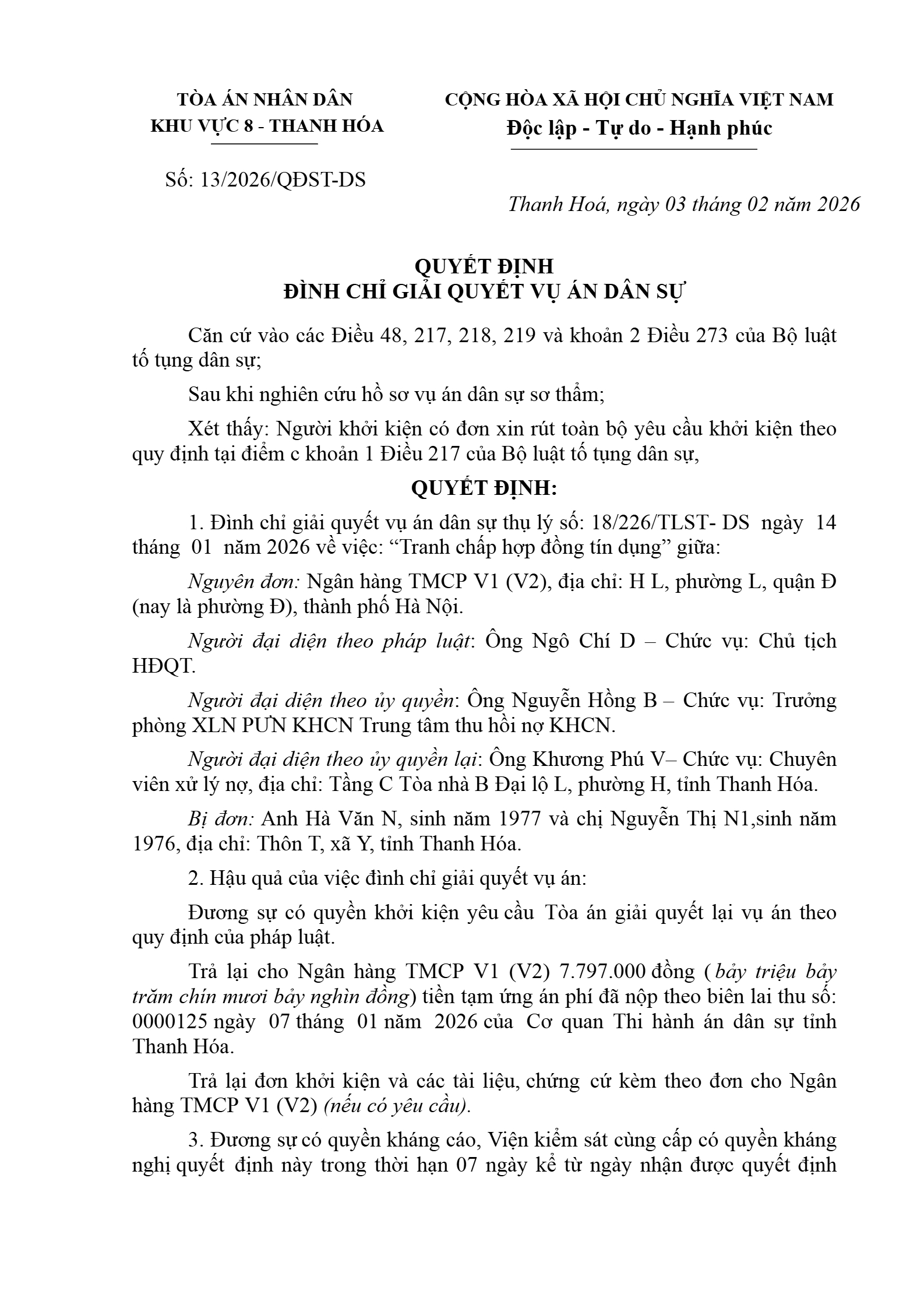Quyết định số 13/2026/QĐST-DS ngày 05/02/2026 của Tòa án nhân dân khu vực 8 - Thanh Hóa, tỉnh Thanh Hóa về tranh chấp hợp đồng tín dụng