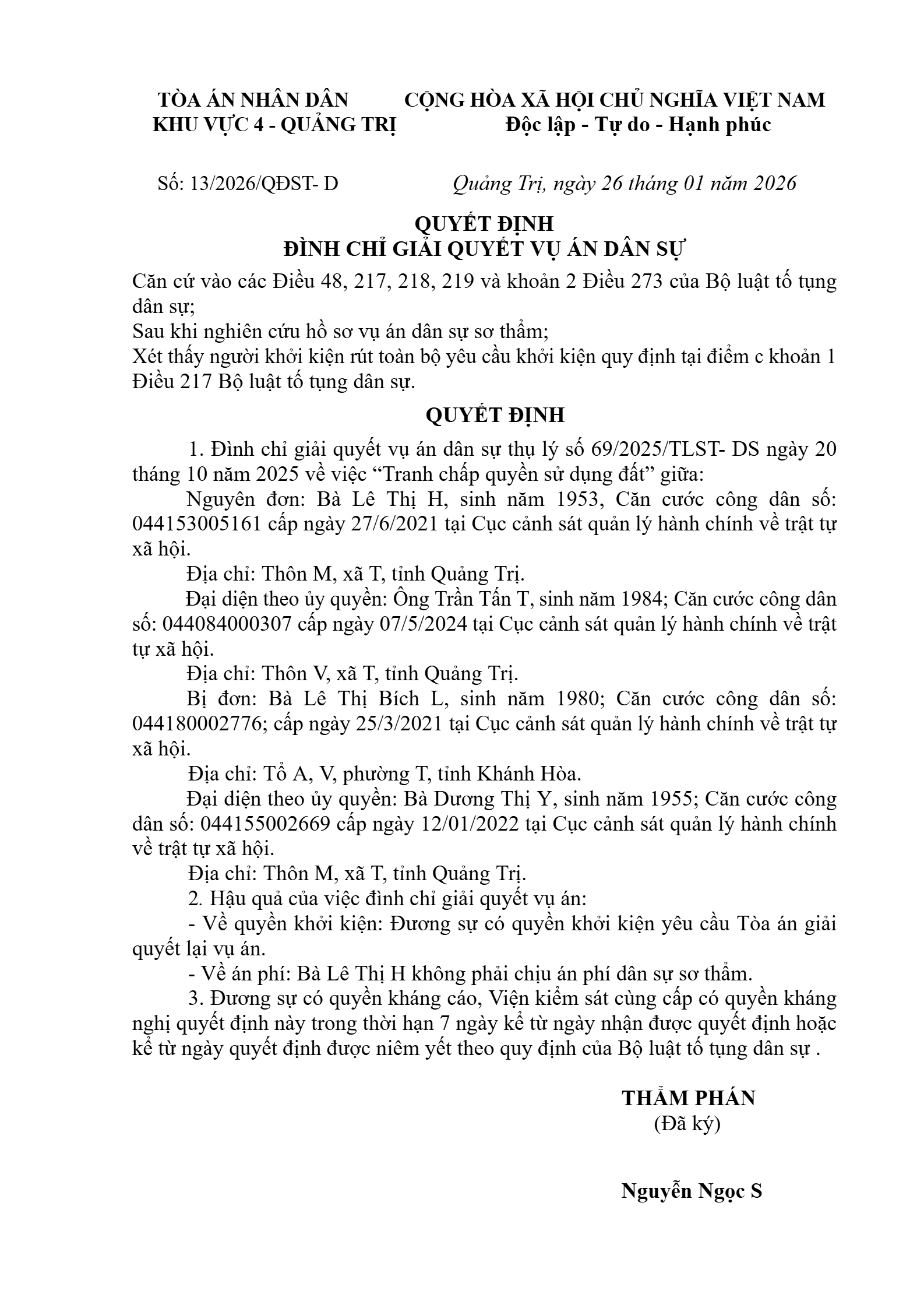 Quyết định số 13/2026/QĐST-DS ngày 26/01/2026 của Tòa án nhân dân khu vực 4 - Quảng Trị, tỉnh Quảng Trị về tranh chấp quyền sử dụng đất