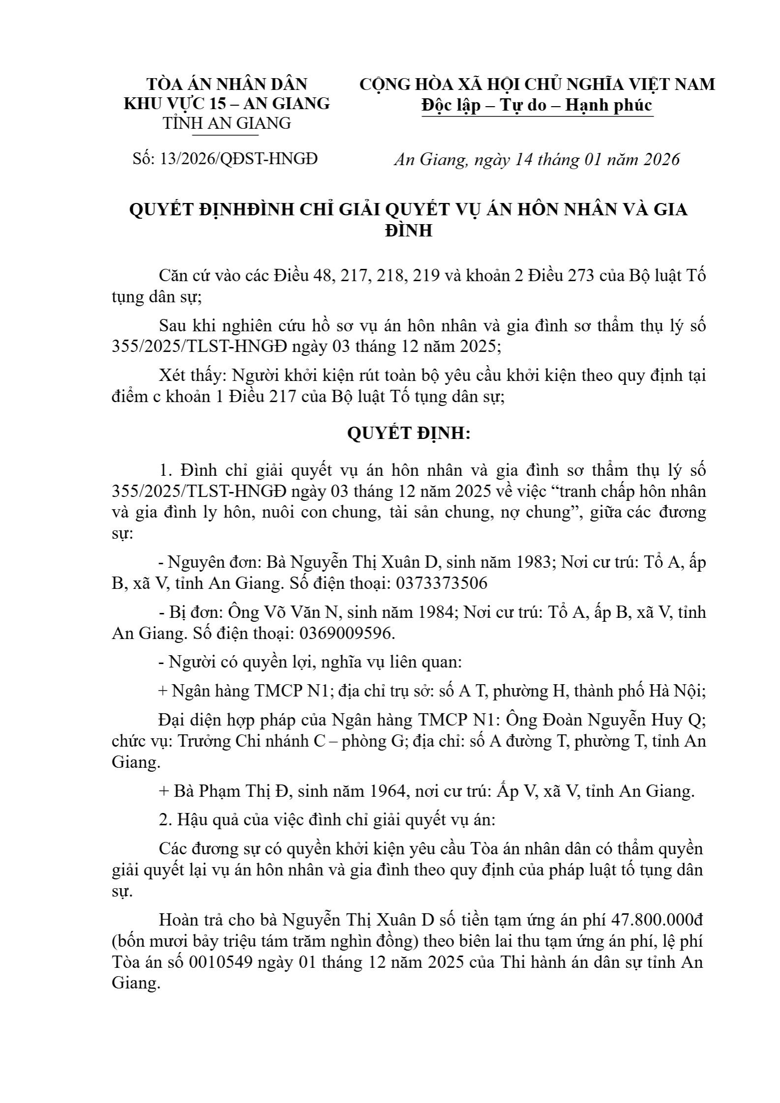 Quyết định số 13/2026/QĐST-HNGĐ ngày 14/01/2026 của Tòa án nhân dân khu vực 15 - An Giang, tỉnh An Giang về vụ án ly hôn về mâu thuẫn gia đình