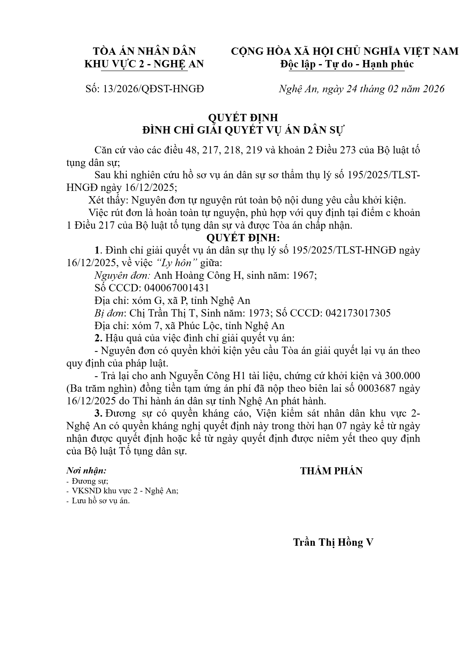 Quyết định số 13/2026/QĐST-HNGĐ ngày 24/02/2026 của Tòa án nhân dân khu vực 2 - Nghệ An, tỉnh Nghệ An về vụ án ly hôn về mâu thuẫn gia đình