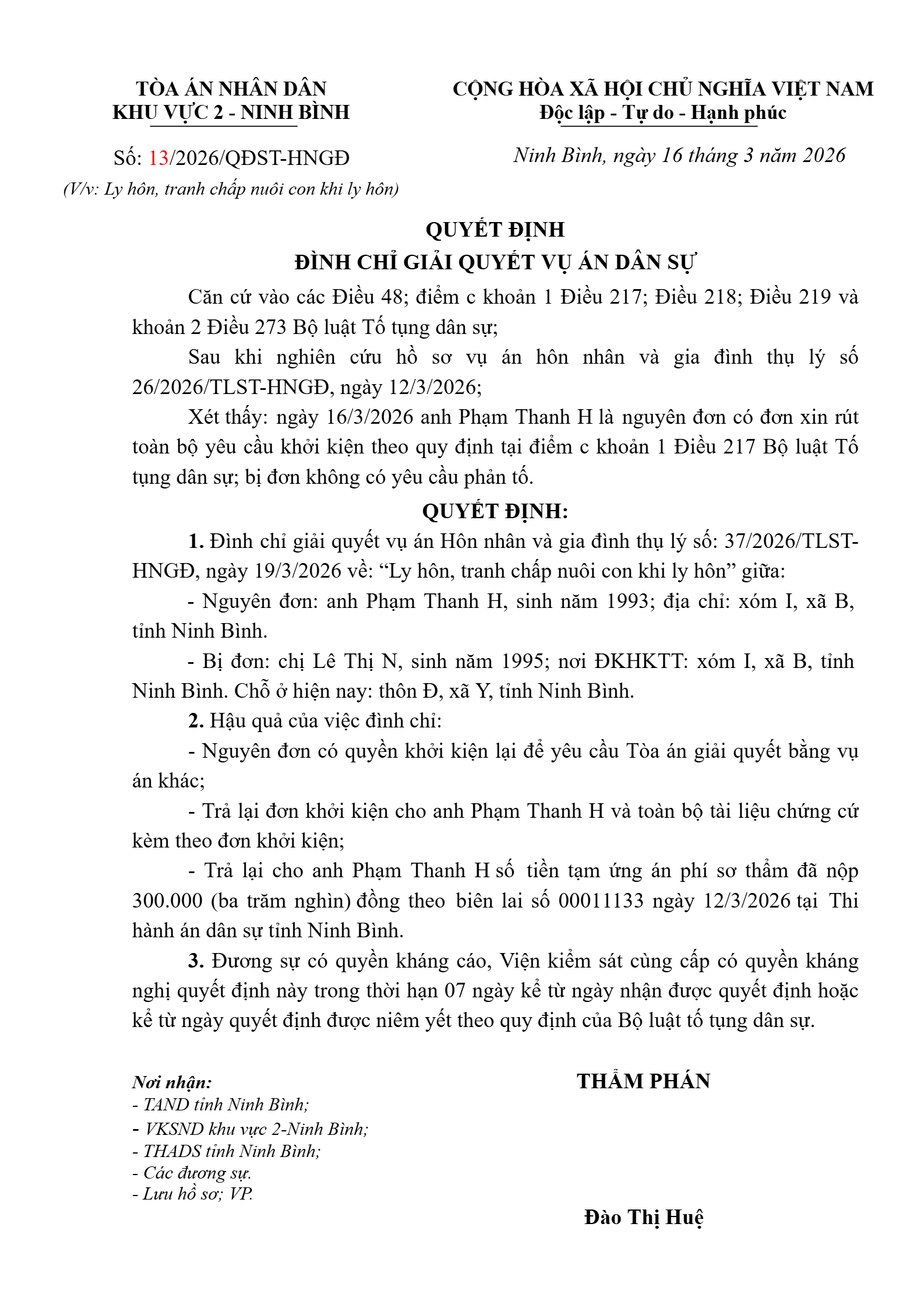 Quyết định số 13/2026/QĐST-HNGĐ ngày 16/03/2026 của Tòa án nhân dân khu vực 2 - Ninh Bình, tỉnh Ninh Bình về vụ án ly hôn về mâu thuẫn gia đình