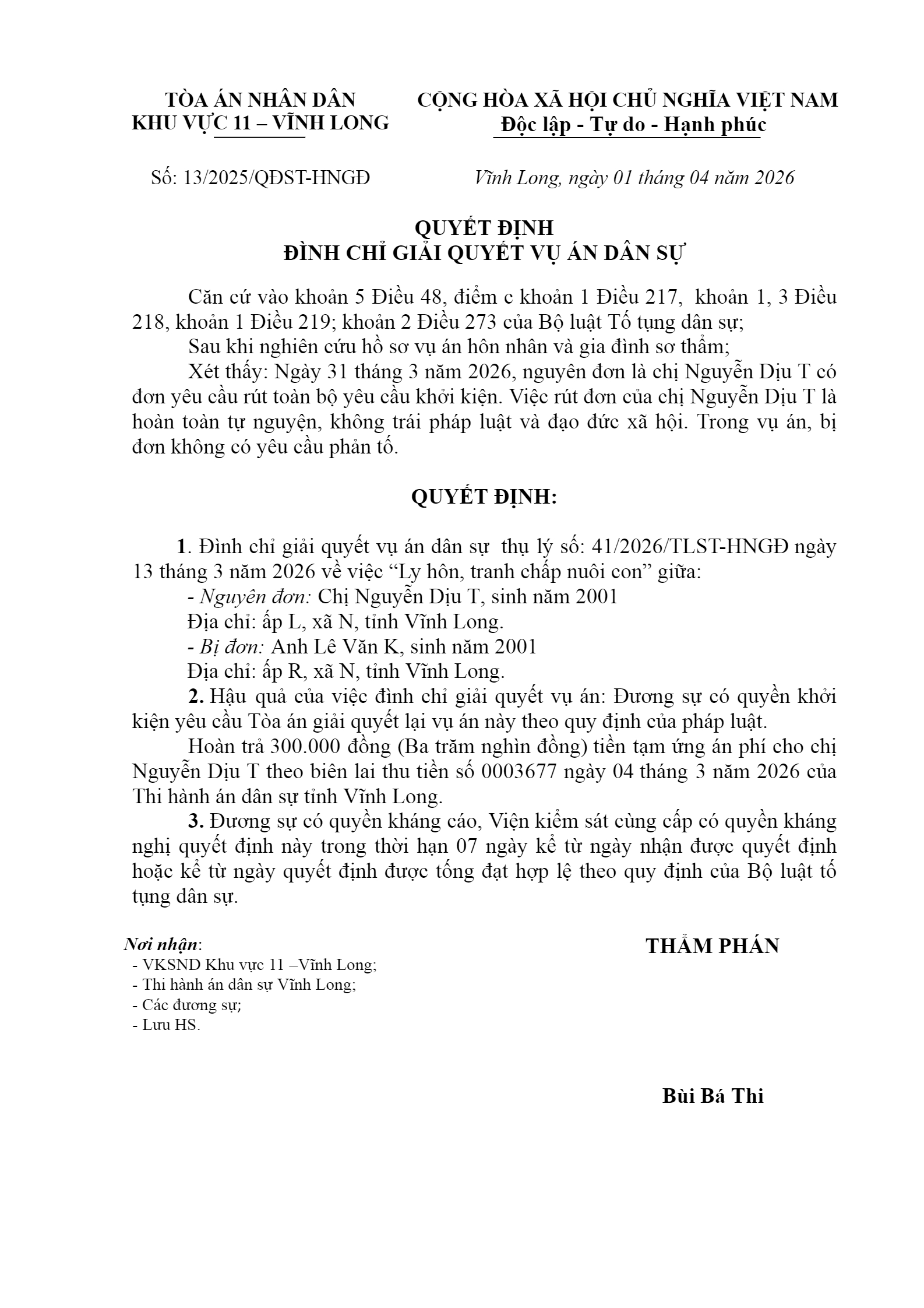 Quyết định số 13/2026/QĐST-HNGĐ ngày 01/04/2026 của Tòa án nhân dân khu vực 11 - Vĩnh Long, tỉnh Vĩnh Long về vụ án ly hôn về mâu thuẫn gia đình