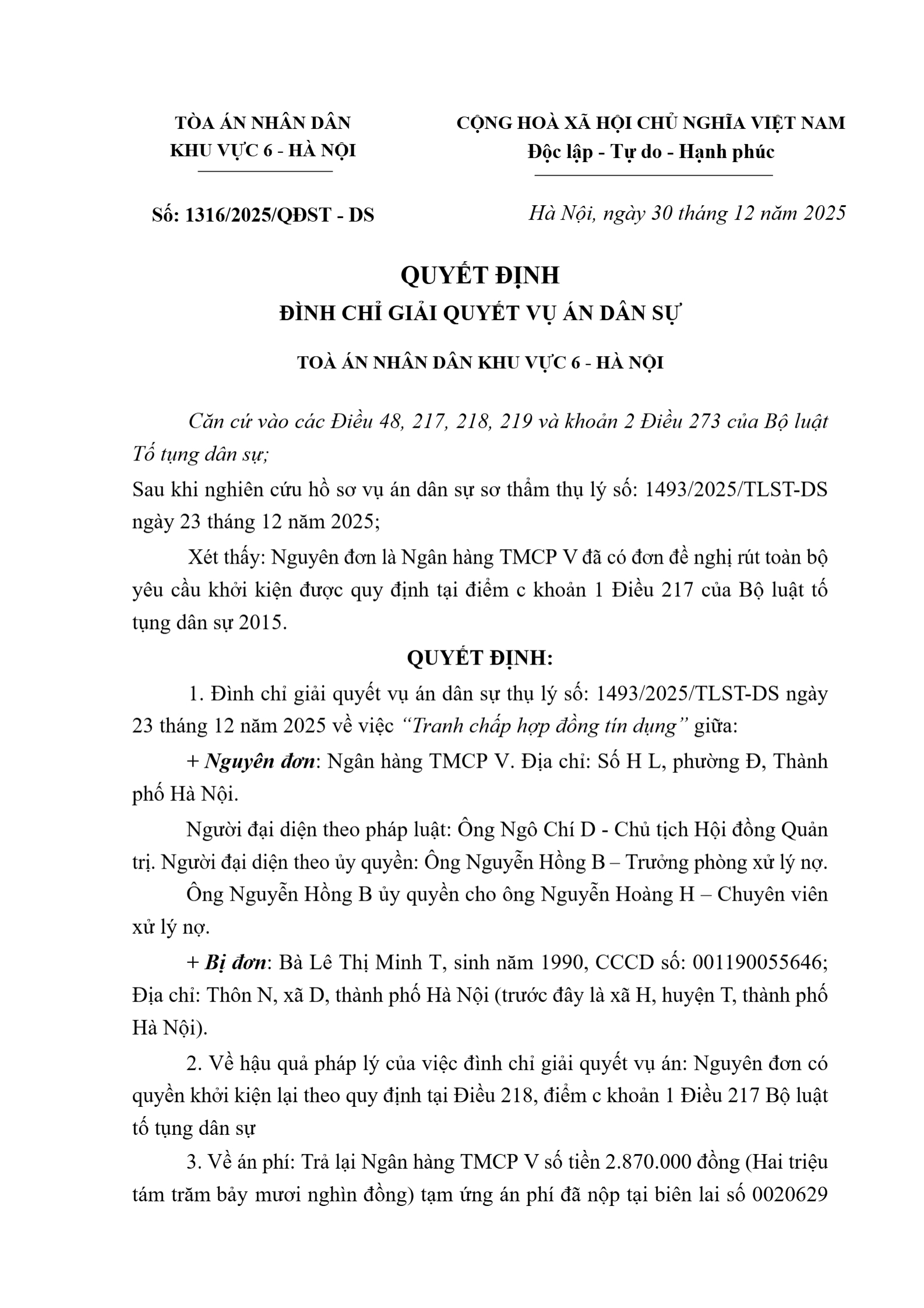 Quyết định số 1316/2025/QĐST-DS ngày 30/12/2025 của Tòa án nhân dân khu vực 6 - Hà Nội, TP. Hà Nội về tranh chấp hợp đồng tín dụng