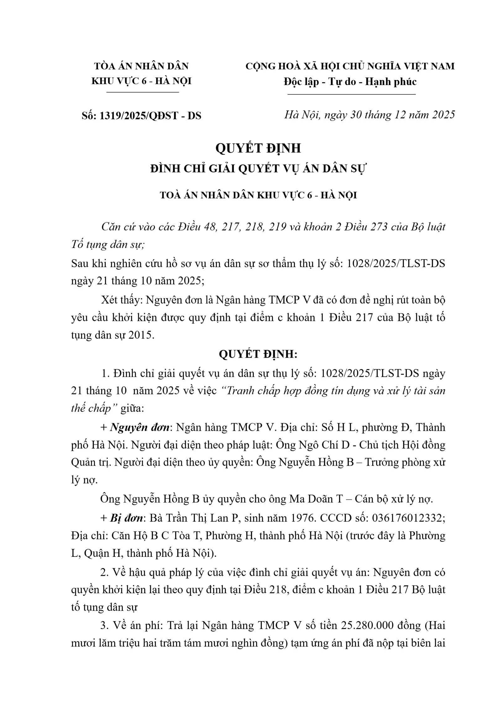 | Tên Quyết định: | Quyết định số 1319/2025/QĐST-DS ngày 30/12/2025 của Tòa án nhân dân khu vực 6 - Hà Nội, TP. Hà Nội về tranh chấp hợp đồng tín dụng |
