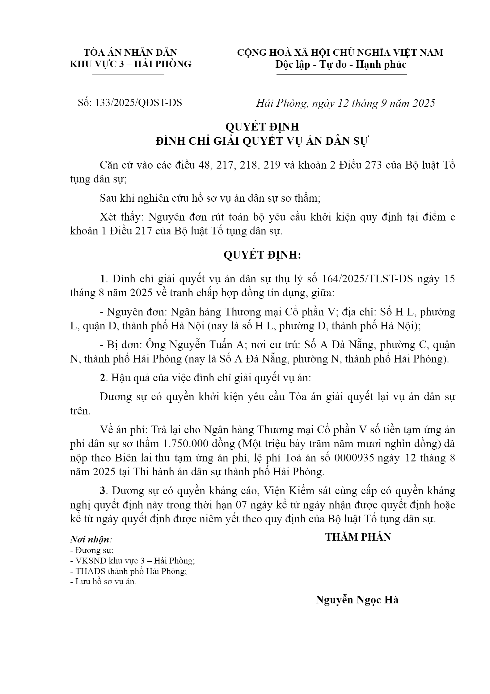 Quyết định số 133/2025/QĐST-DS ngày 12/09/2025 của Tòa án nhân dân khu vực 3 - Hải Phòng, TP. Hải Phòng về tranh chấp hợp đồng tín dụng