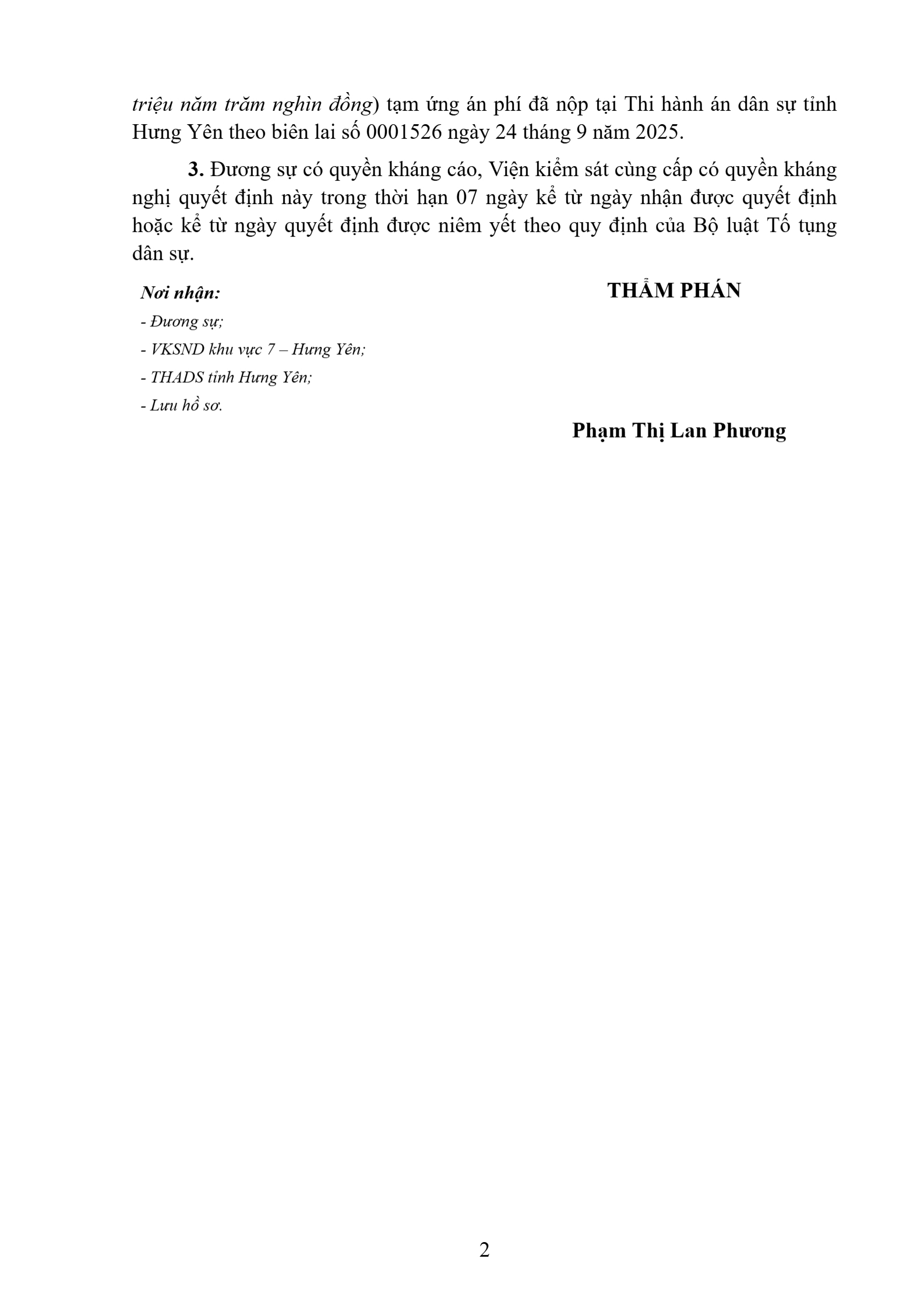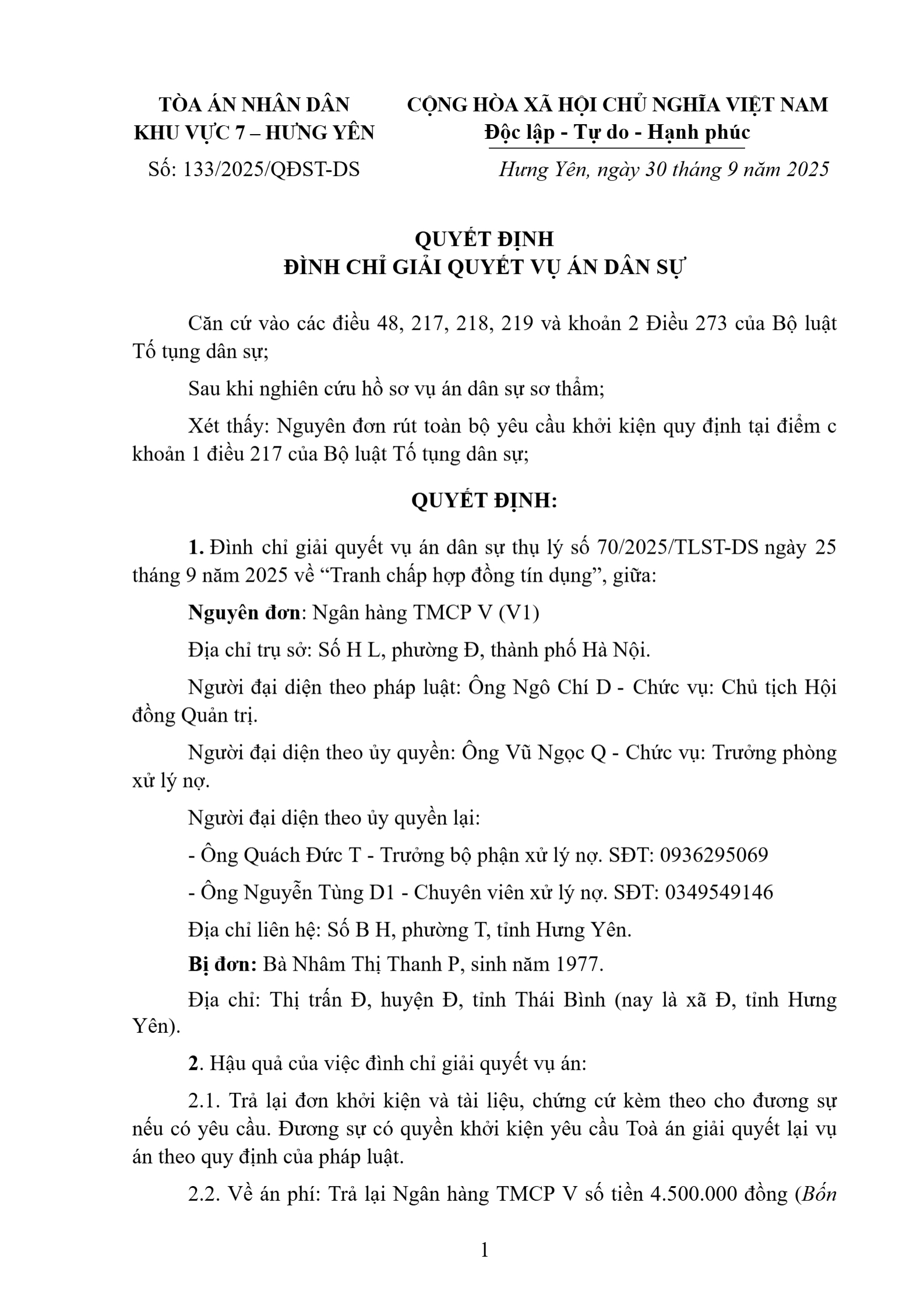 Quyết định số 133/2025/QĐST-DS ngày 30/09/2025 của Tòa án nhân dân khu vực 7 - Hưng Yên, tỉnh Hưng Yên về tranh chấp hợp đồng tín dụng
