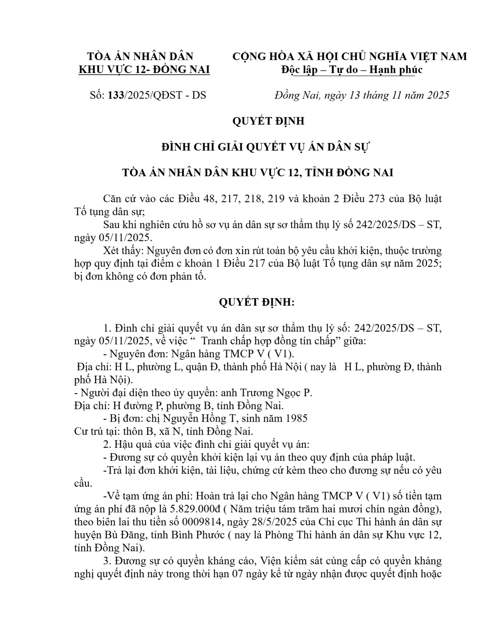Quyết định số 133/2025/QĐST-DS ngày 13/11/2025 của Tòa án nhân dân khu vực 12 - Đồng Nai, tỉnh Đồng Nai về tranh chấp hợp đồng vay tài sản