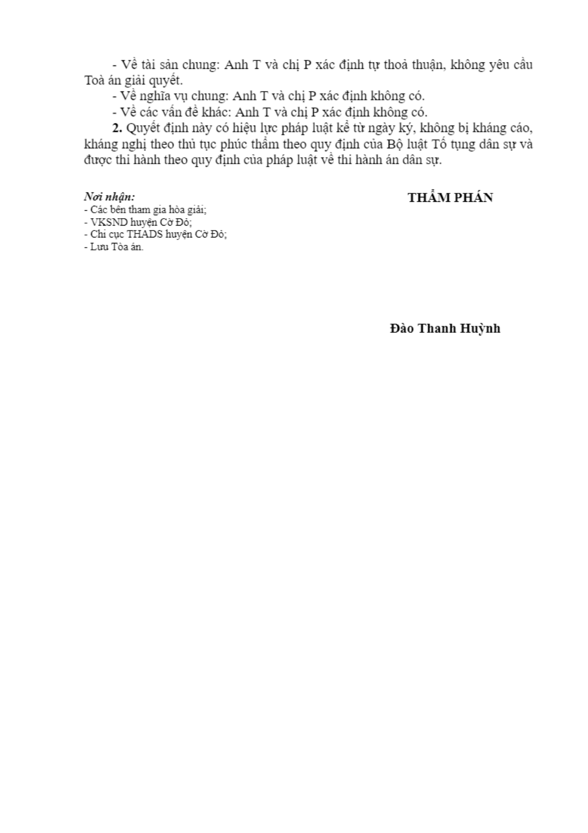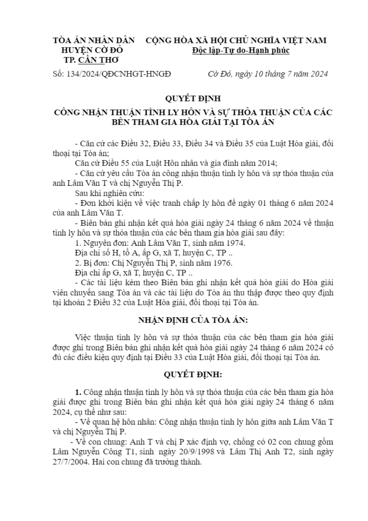 Quyết định số 134/2024/QĐCNHGT-HNGĐ ngày 10/07/2024 của TAND huyện Cờ Đỏ, TP. Cần Thơ về vụ án ly hôn về mâu thuẫn gia đình