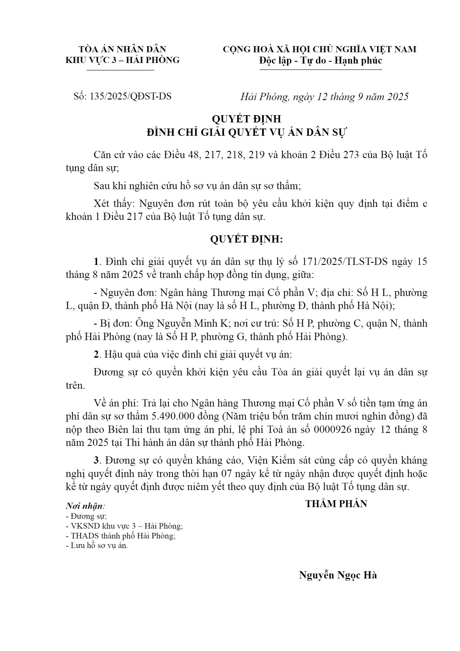 Quyết định số 135/2025/QĐST-DS ngày 12/09/2025 của Tòa án nhân dân khu vực 3 - Hải Phòng, TP. Hải Phòng về tranh chấp hợp đồng tín dụng