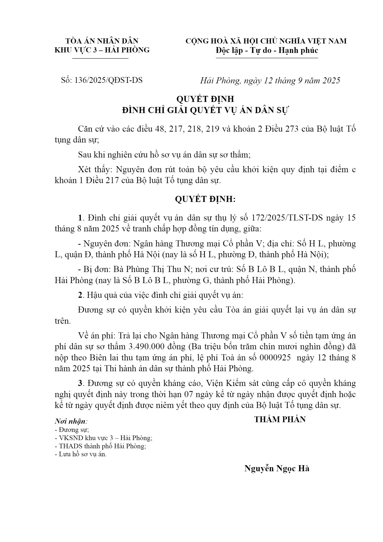 Quyết định số 136/2025/QĐST-DS ngày 12/09/2025 của Tòa án nhân dân khu vực 3 - Hải Phòng, TP. Hải Phòng về tranh chấp hợp đồng tín dụng