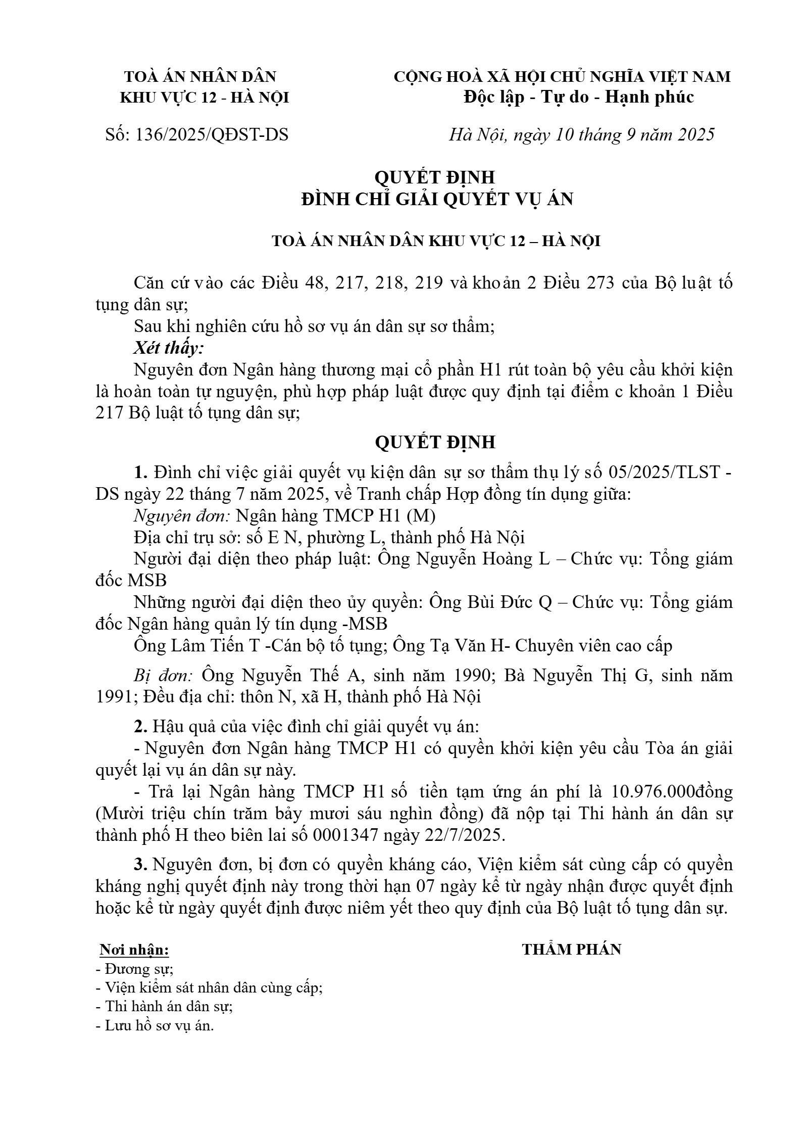 Quyết định số 136/2025/QĐST-DS ngày 27/09/2025 của Tòa án nhân dân khu vực 12 - Hà Nội, TP. Hà Nội về tranh chấp hợp đồng tín dụng