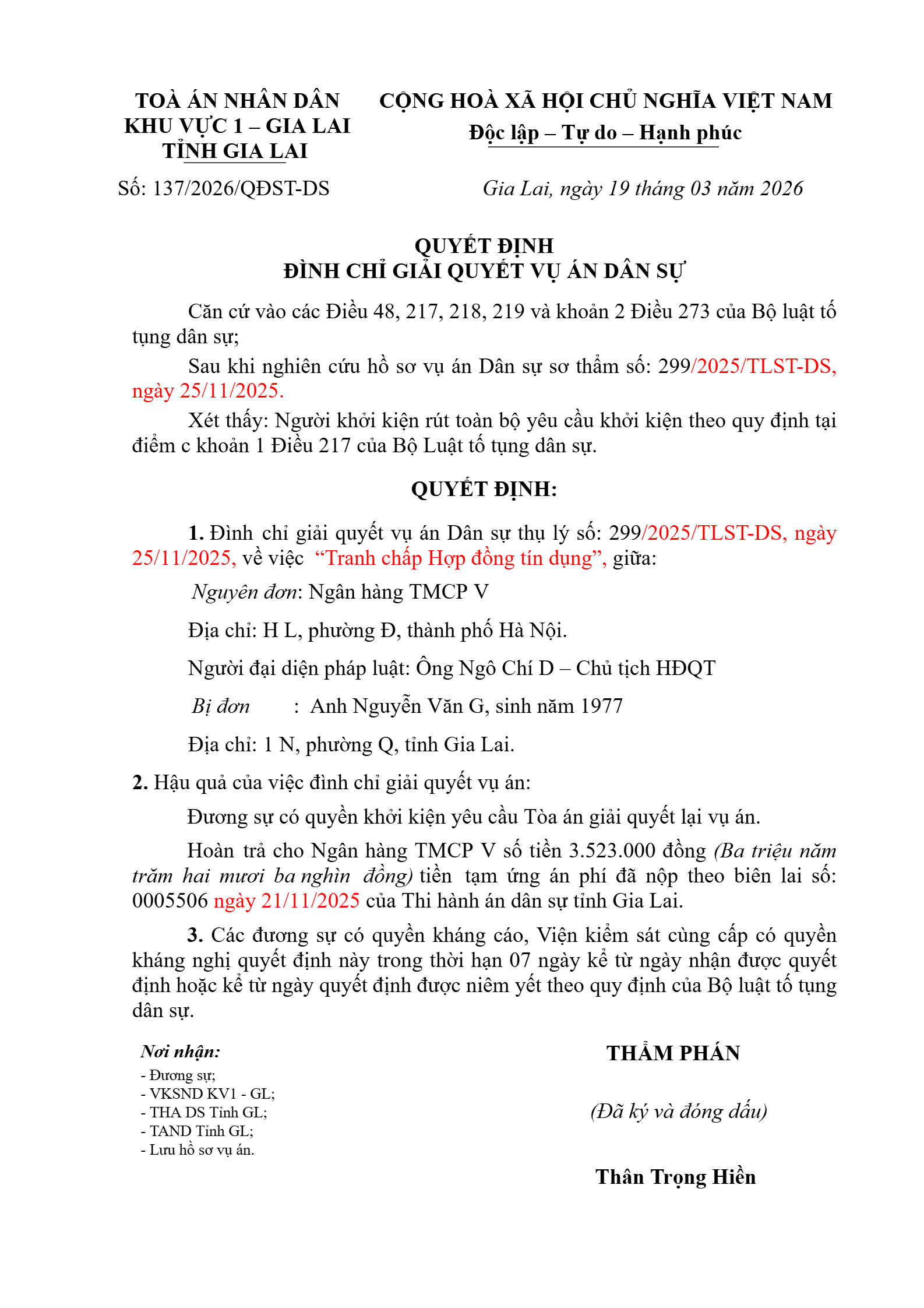 Quyết định số 137/2026/QĐST-DS ngày 19/03/2026 của Tòa án nhân dân khu vực 1 - Gia Lai, tỉnh Gia Lai về tranh chấp hợp đồng tín dụng