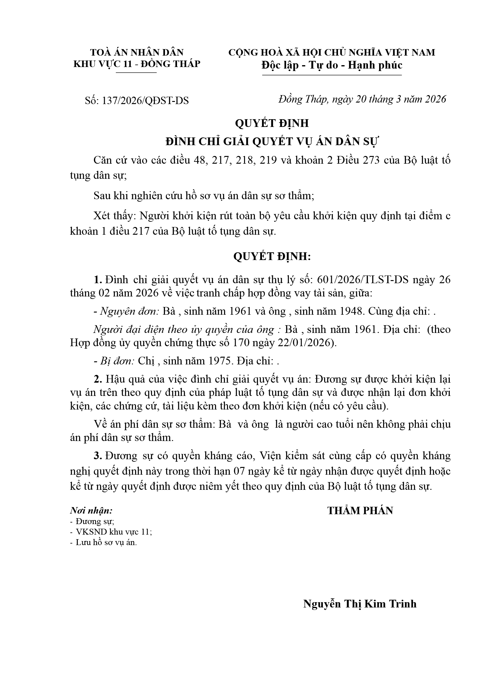 Quyết định số 137/2026/QĐST-DS ngày 20/03/2026 của Tòa án nhân dân khu vực 11 - Đồng Tháp, tỉnh Đồng Tháp về tranh chấp hợp đồng vay tài sản