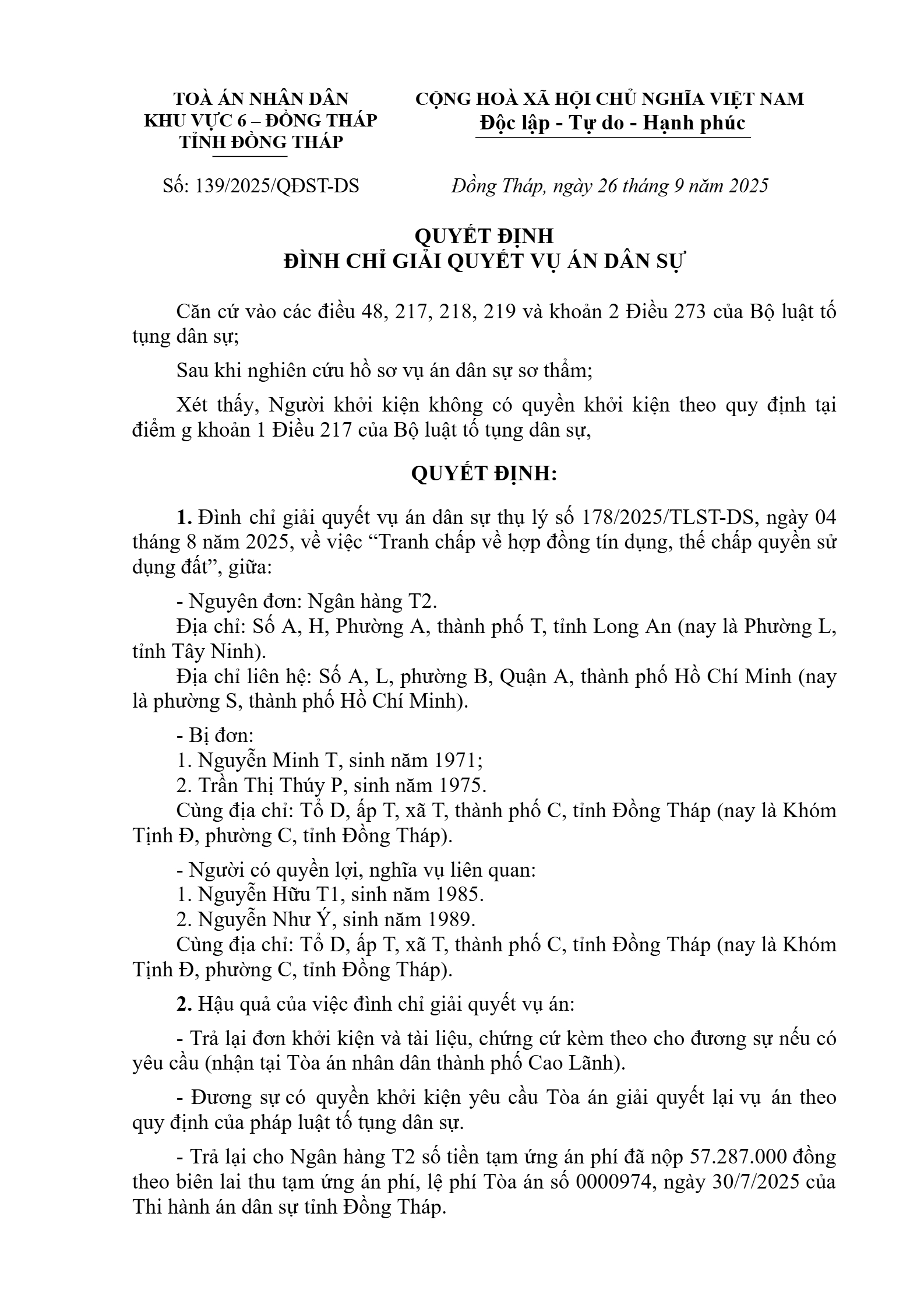 Quyết định số 139/2025/QĐST-DS ngày 26/09/2025 của Tòa án nhân dân khu vực 6 - Đồng Tháp, tỉnh Đồng Tháp về tranh chấp hợp đồng tín dụng