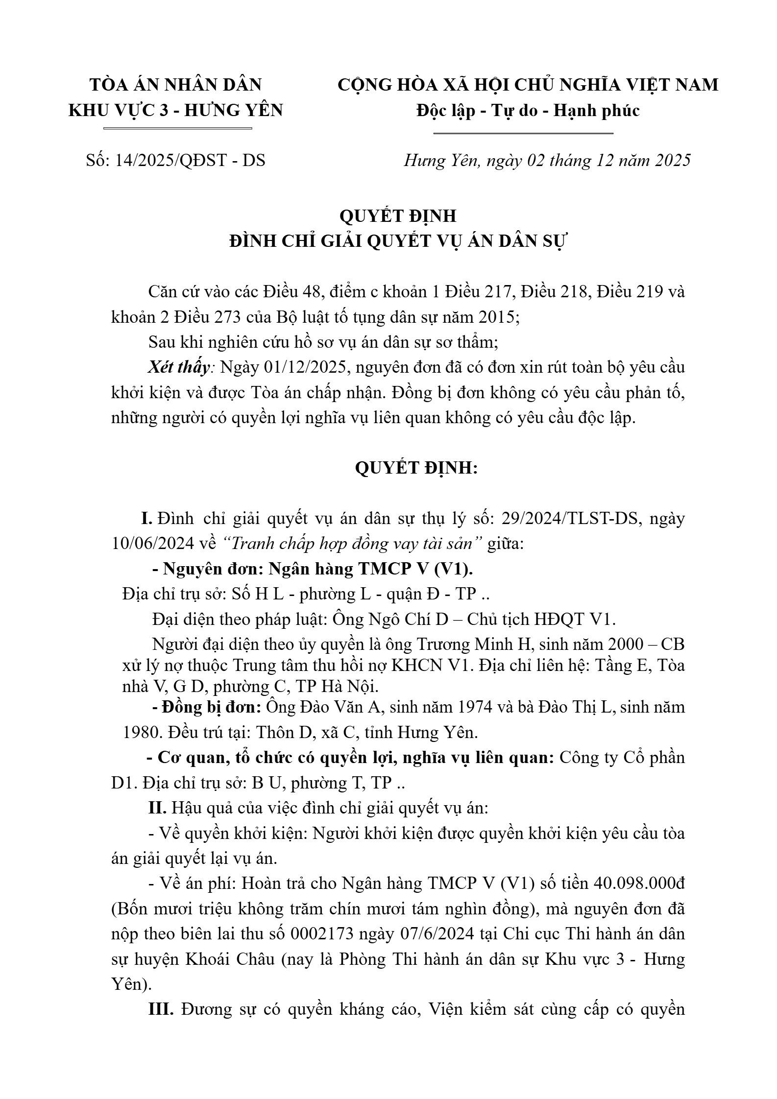 Quyết định số 14/2025/QĐST ngày 02/12/2025 của Tòa án nhân dân khu vực 3 - Hưng Yên, tỉnh Hưng Yên về tranh chấp hợp đồng tín dụng