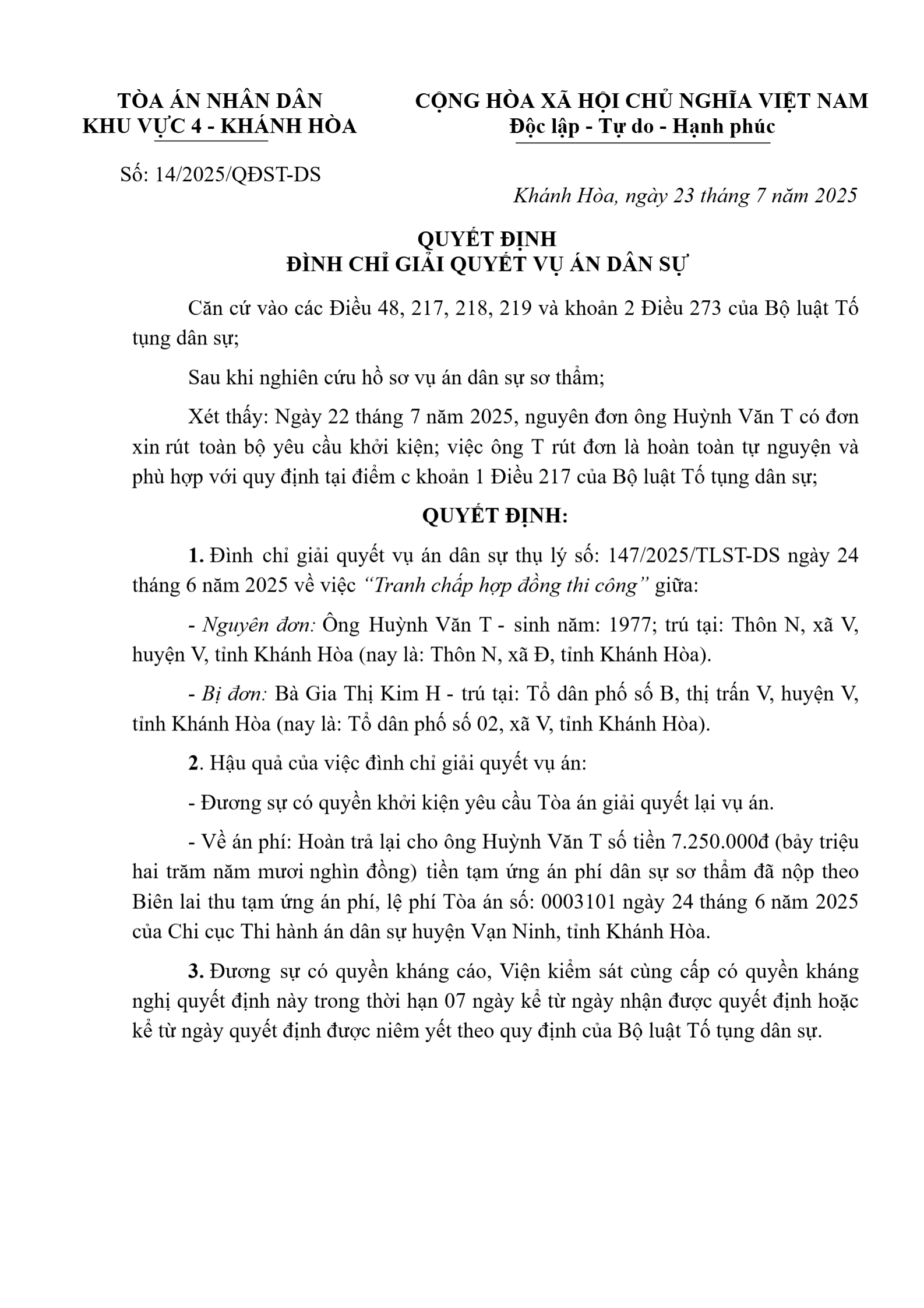 Quyết định số 14/2025/QĐST-DS ngày 23/07/2025 của Tòa án nhân dân khu vực 4 - Khánh Hòa, tỉnh Khánh Hòa về tranh chấp hợp đồng gia công
