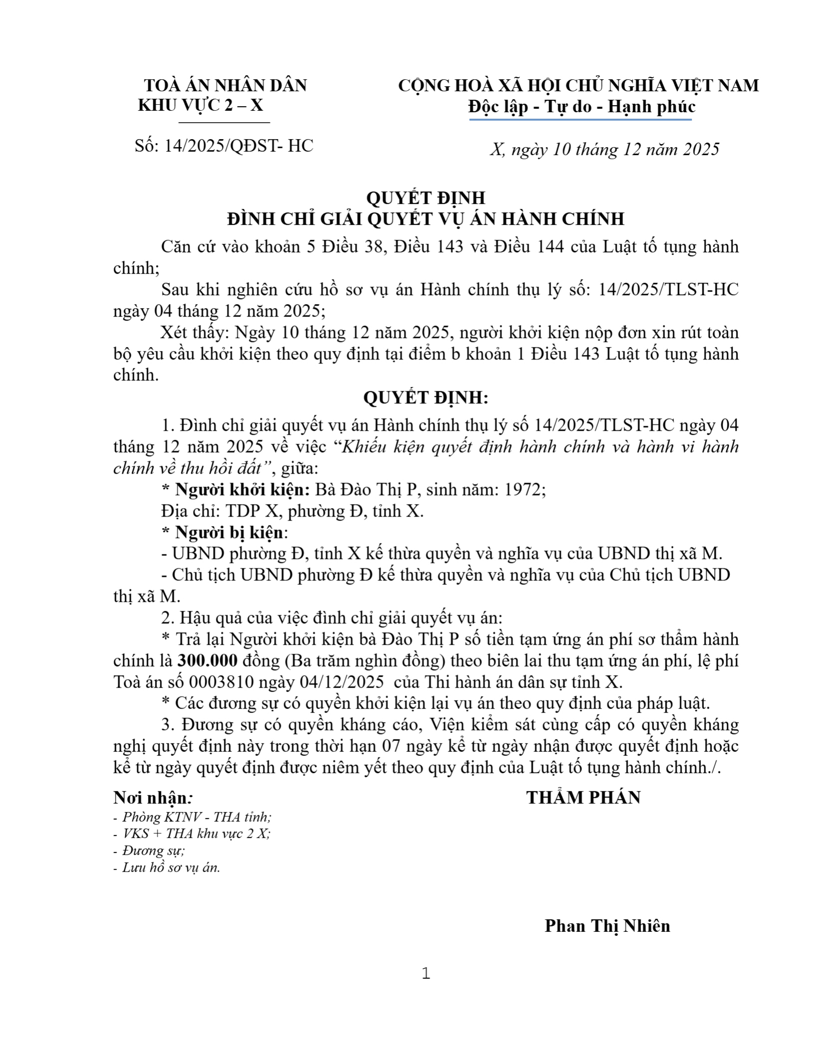 | Thông tin về vụ án: | QĐ ĐC số 14 ngày 10.12.2025 giữa nguyên đơn Đào Thị Phụ và bị đơn UBND phường Đường Hào, chủ tịch UBND phường Đường Hào |