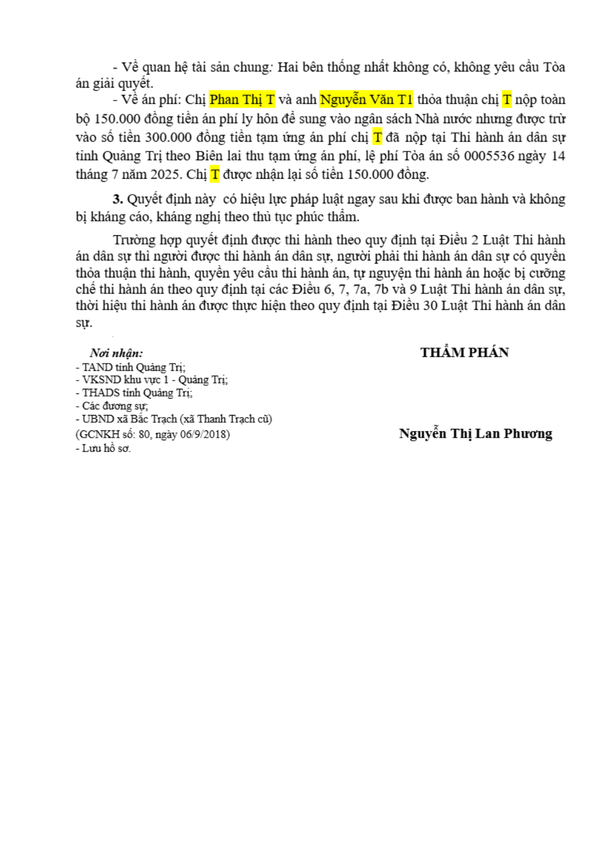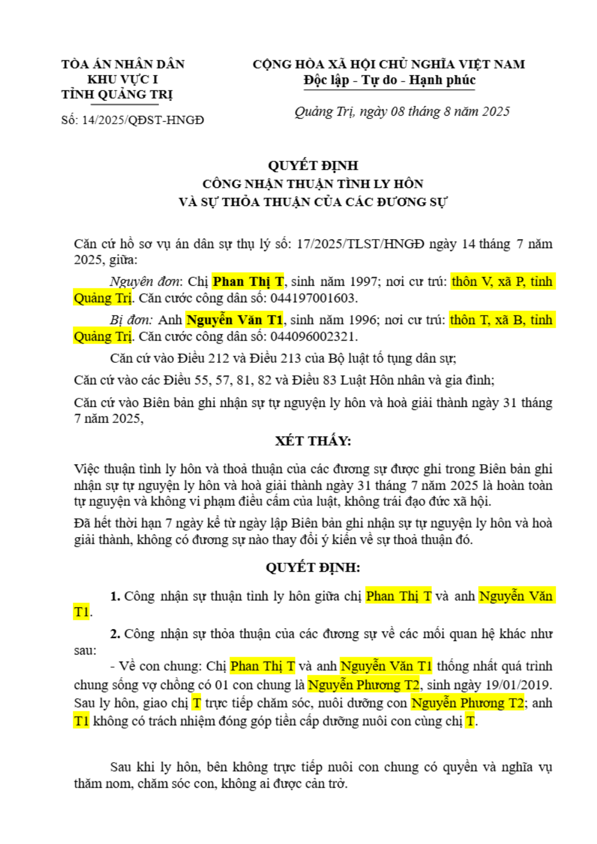Quyết định số 14/2025/QĐST-HNGĐ ngày 08/08/2025 của Tòa án nhân dân khu vực 1 - Quảng Trị, tỉnh Quảng Trị về vụ án ly hôn về mâu thuẫn gia đình